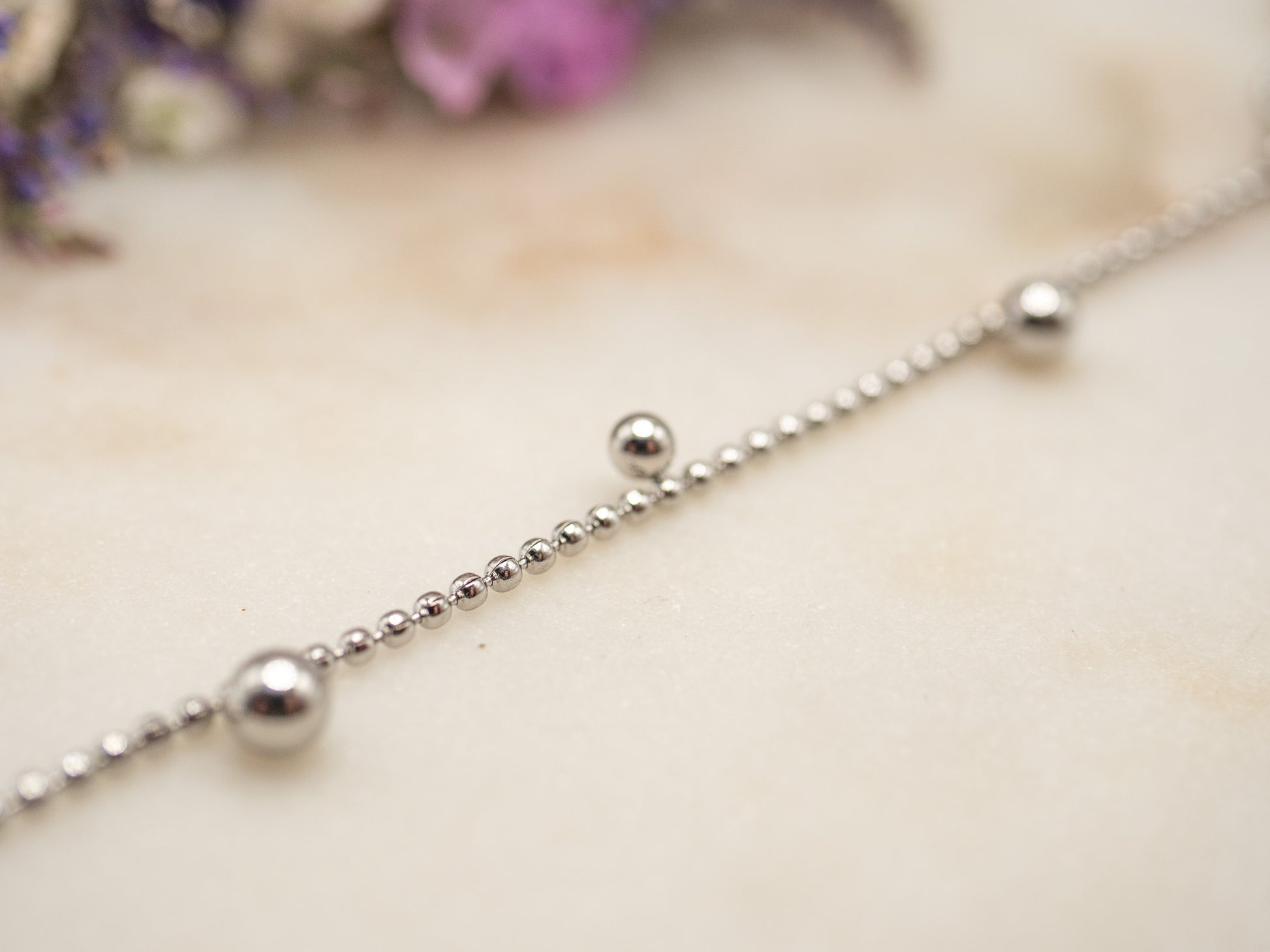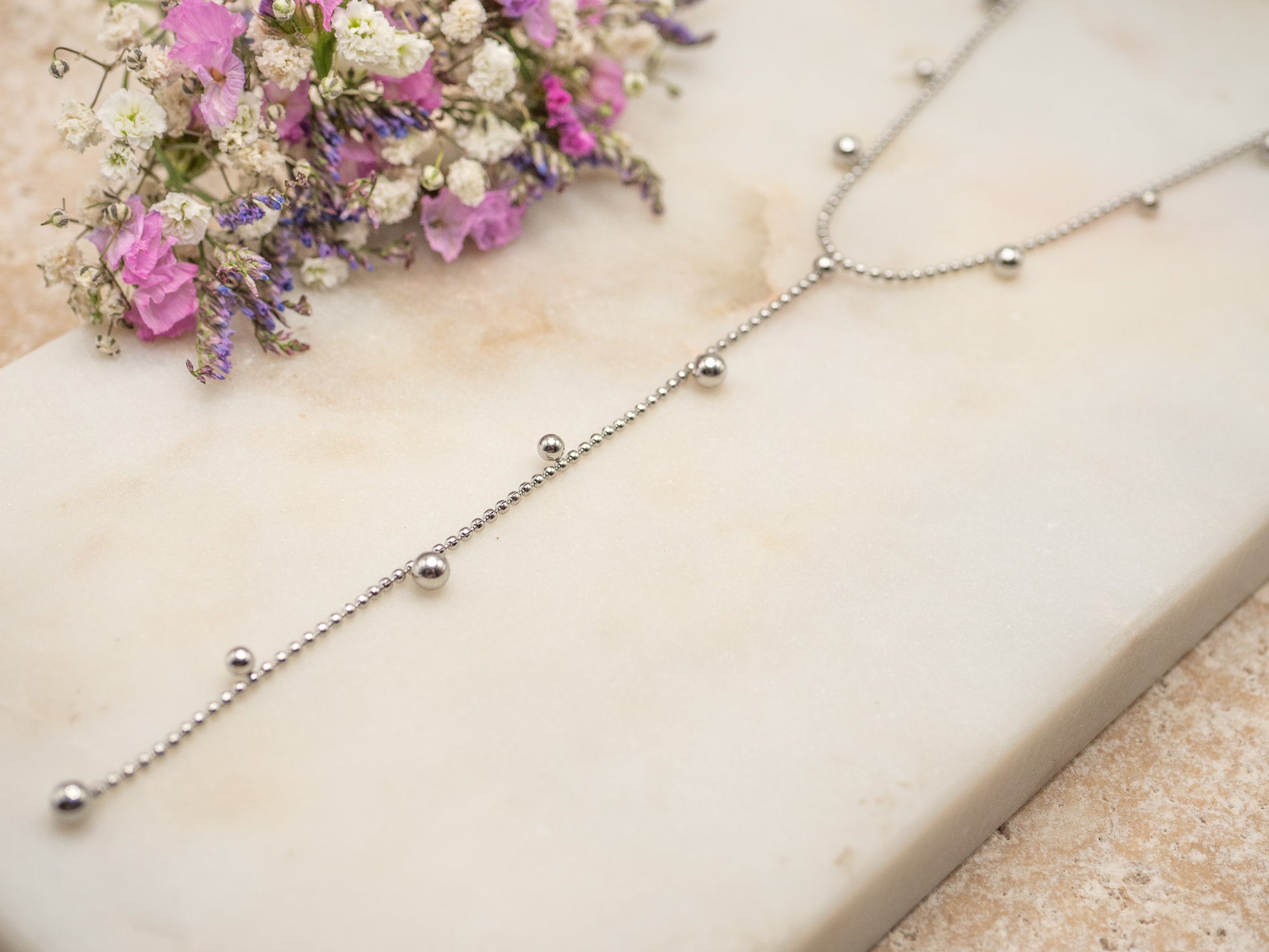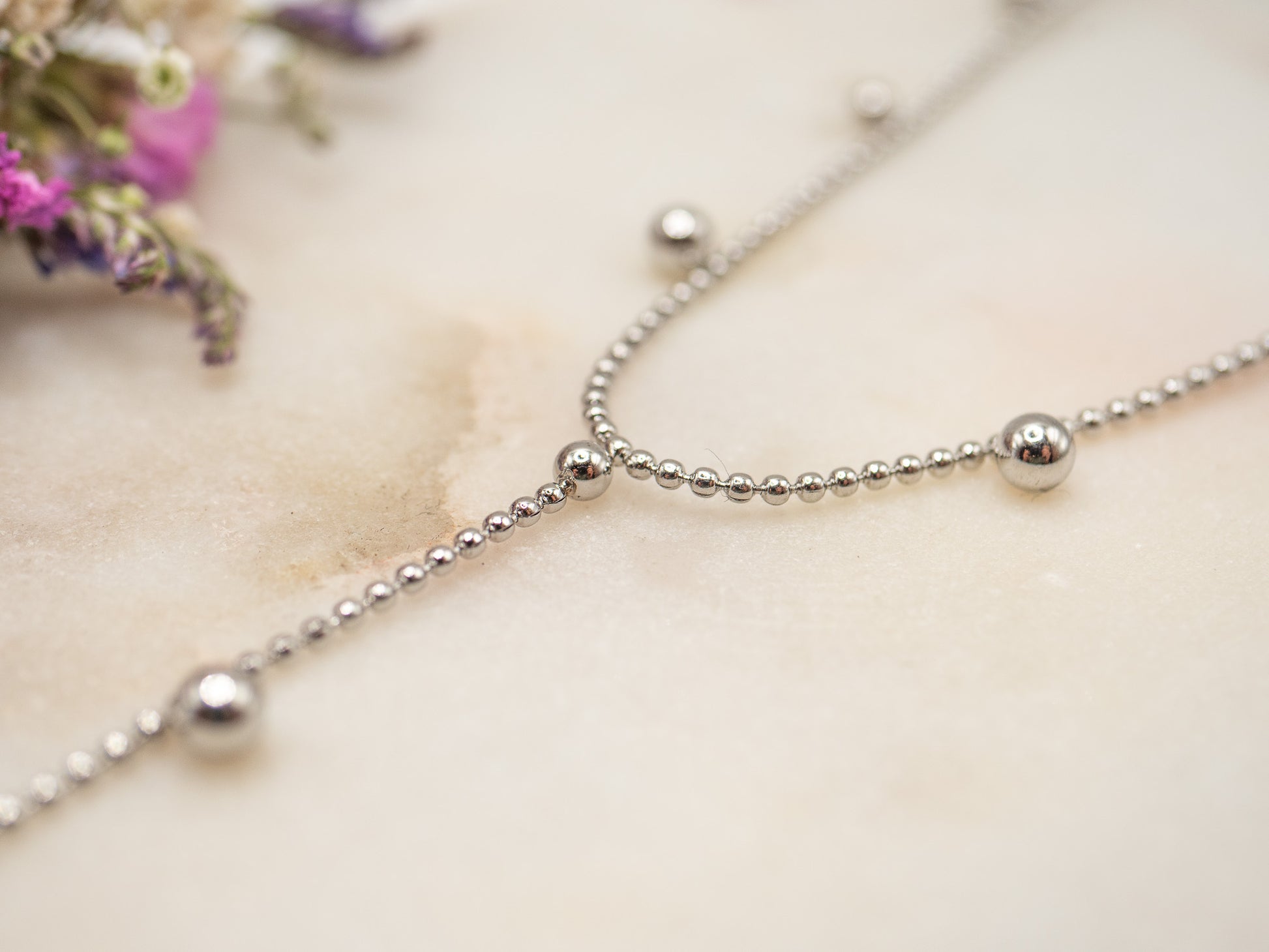 Twiggy est un collier ras-de-cou revisité. Sa chaîne en acier inoxydable se pare de petites perles argentées, ponctuées de sphères plus généreuses qui créent un jeu subtil de lumière et de volume. Un bijou graphique et minimaliste, parfait pour moderniser instantanément une silhouette.