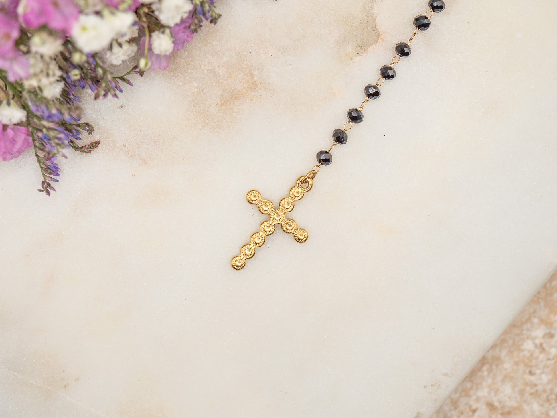 Le collier Veronica revisite avec audace l’iconique croix dorée en lui offrant une allure chic et moderne inspirée du Londres des années 70. En acier inoxydable, la croix (3,5 cm × 2,3 cm) se distingue par ses formes arrondies délicates qui lui confèrent une douceur féminine et raffinée. La chaîne alterne perles rondes facettées en onyx noir (environ 0,4 cm de diamètre chacune) et maillons dorés, créant un contraste saisissant entre lumière et profondeur.