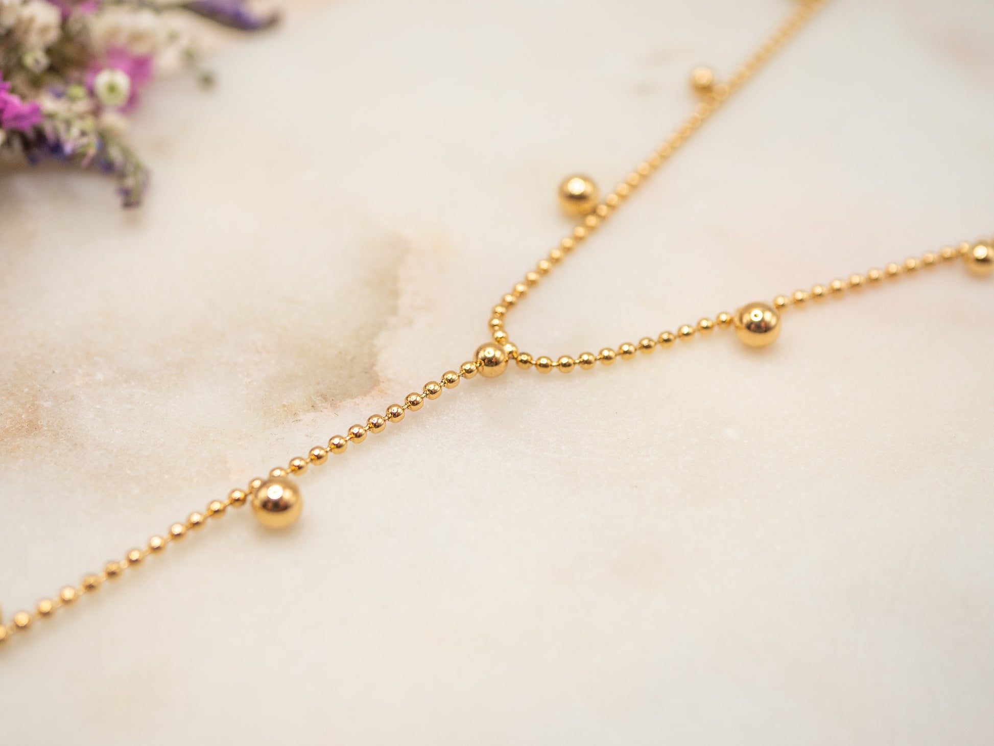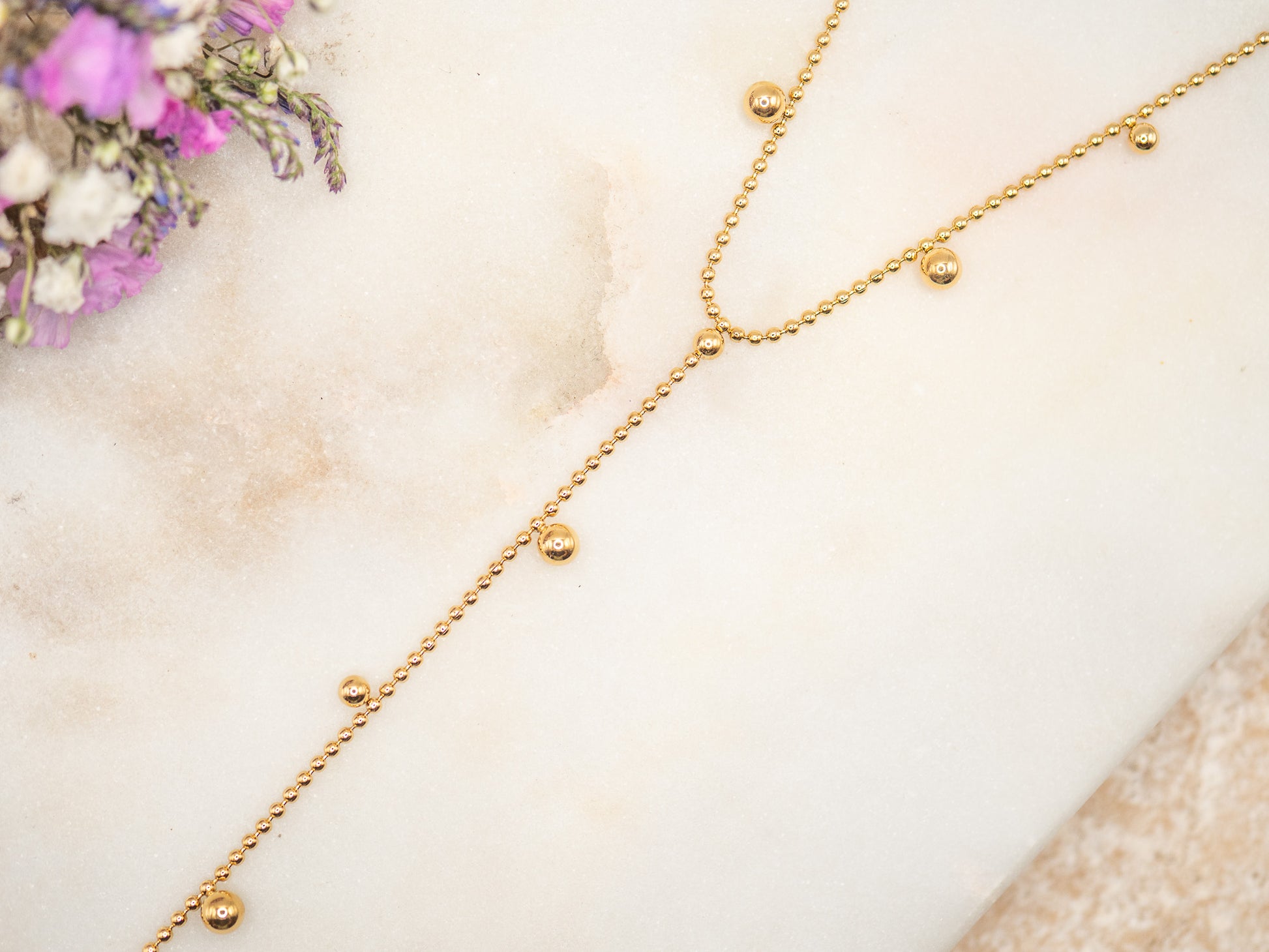 Marianne, hommage à Marianne faithfull, est un collier qui sublime le décolleté avec élégance. Sa chaîne dorée en acier inoxydable, ponctuée de perles sphériques, forme un raffiné pendentif en Y qui attire subtilement la lumière. Un bijou minimaliste et féminin, pensé pour accompagner toutes vos occasions.