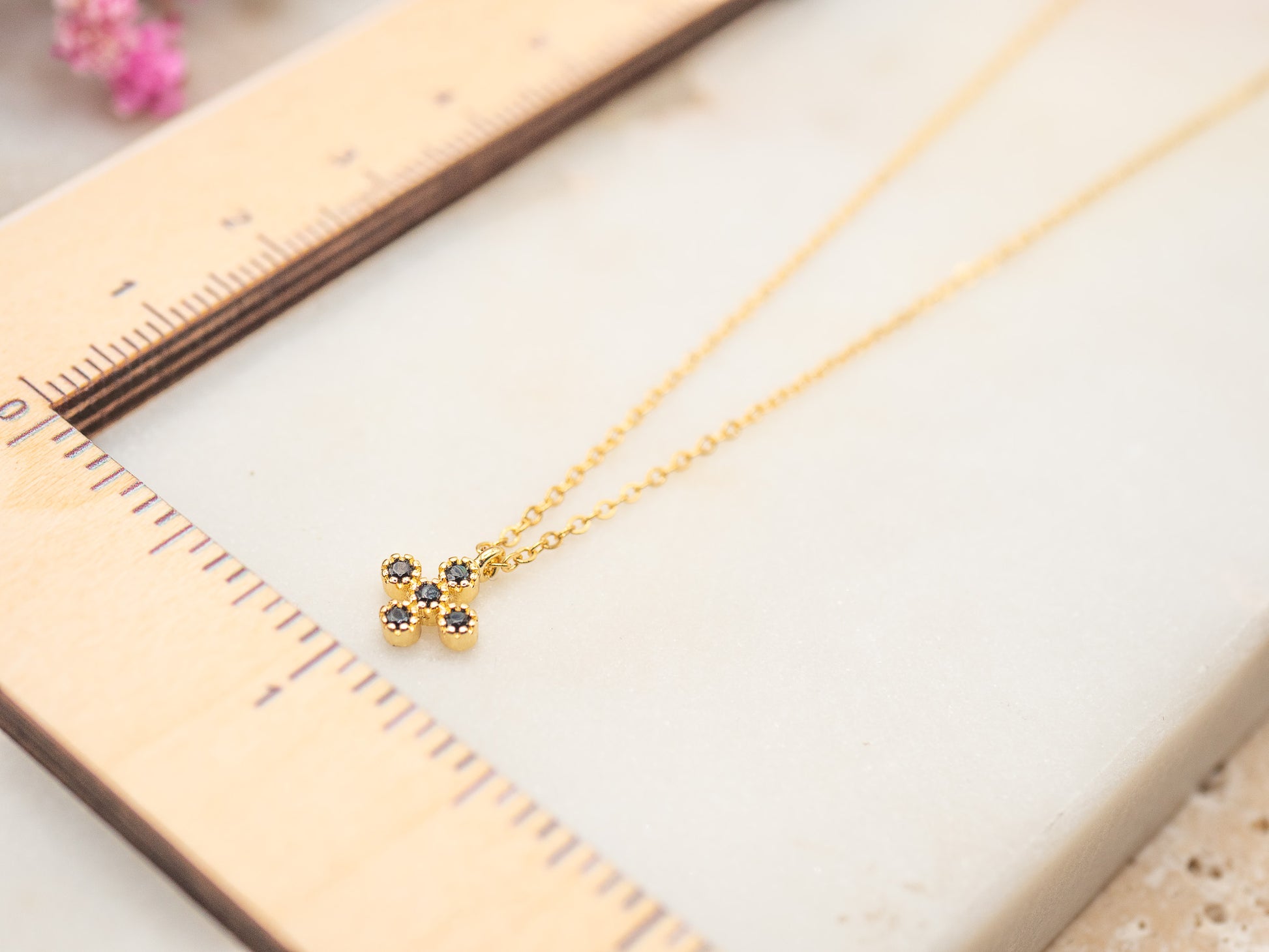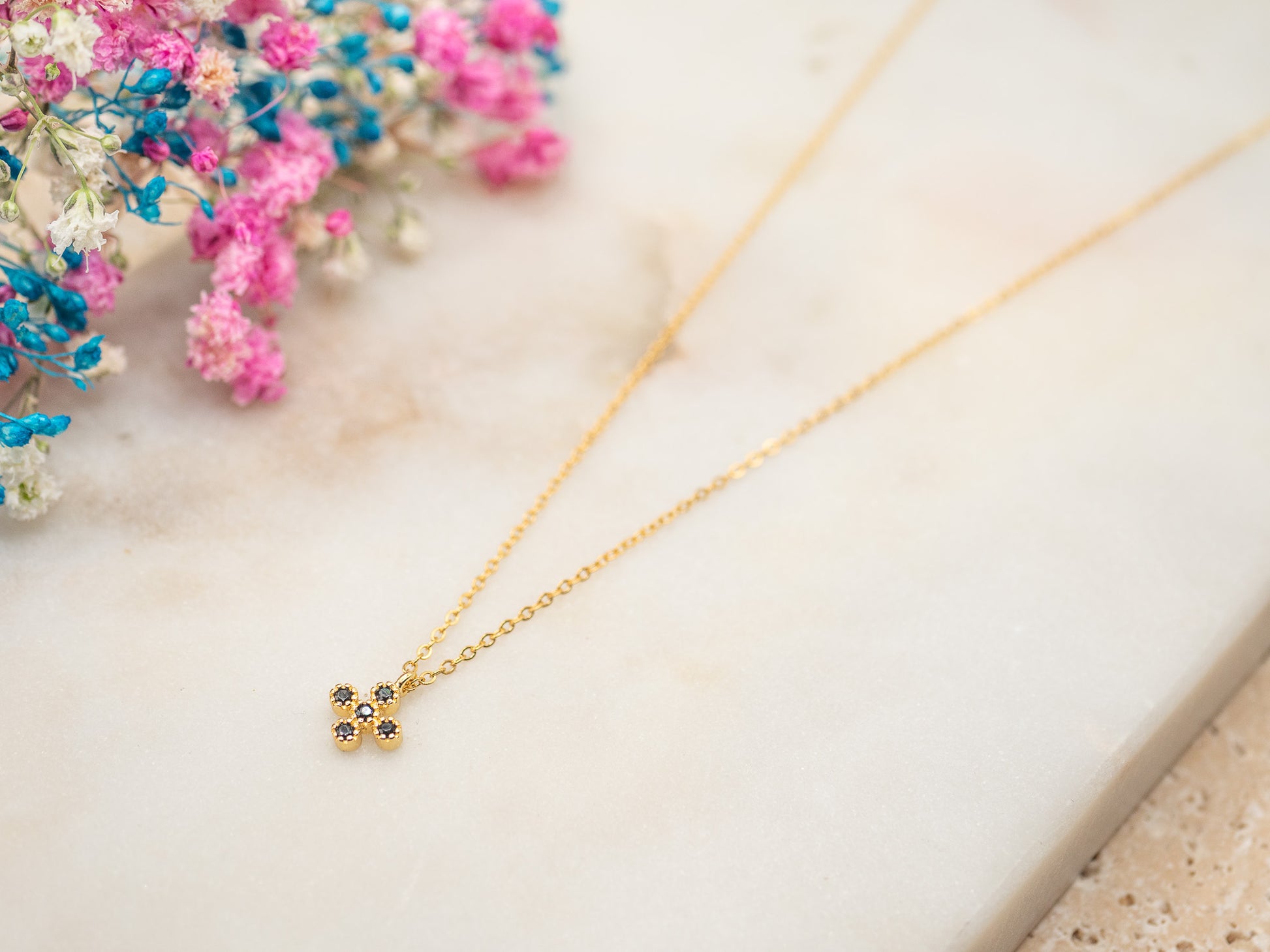 Fin et symbolique, le collier Yesyka se distingue par son délicat pendentif en forme de croix, composé de pierres de spinelle noire subtilement serties dans une monture dorée. Son design épuré évoque les détails ornementaux discrets que l’on découvre en observant de près les grilles, ferronneries et motifs sacrés de l’Alcázar de Séville.