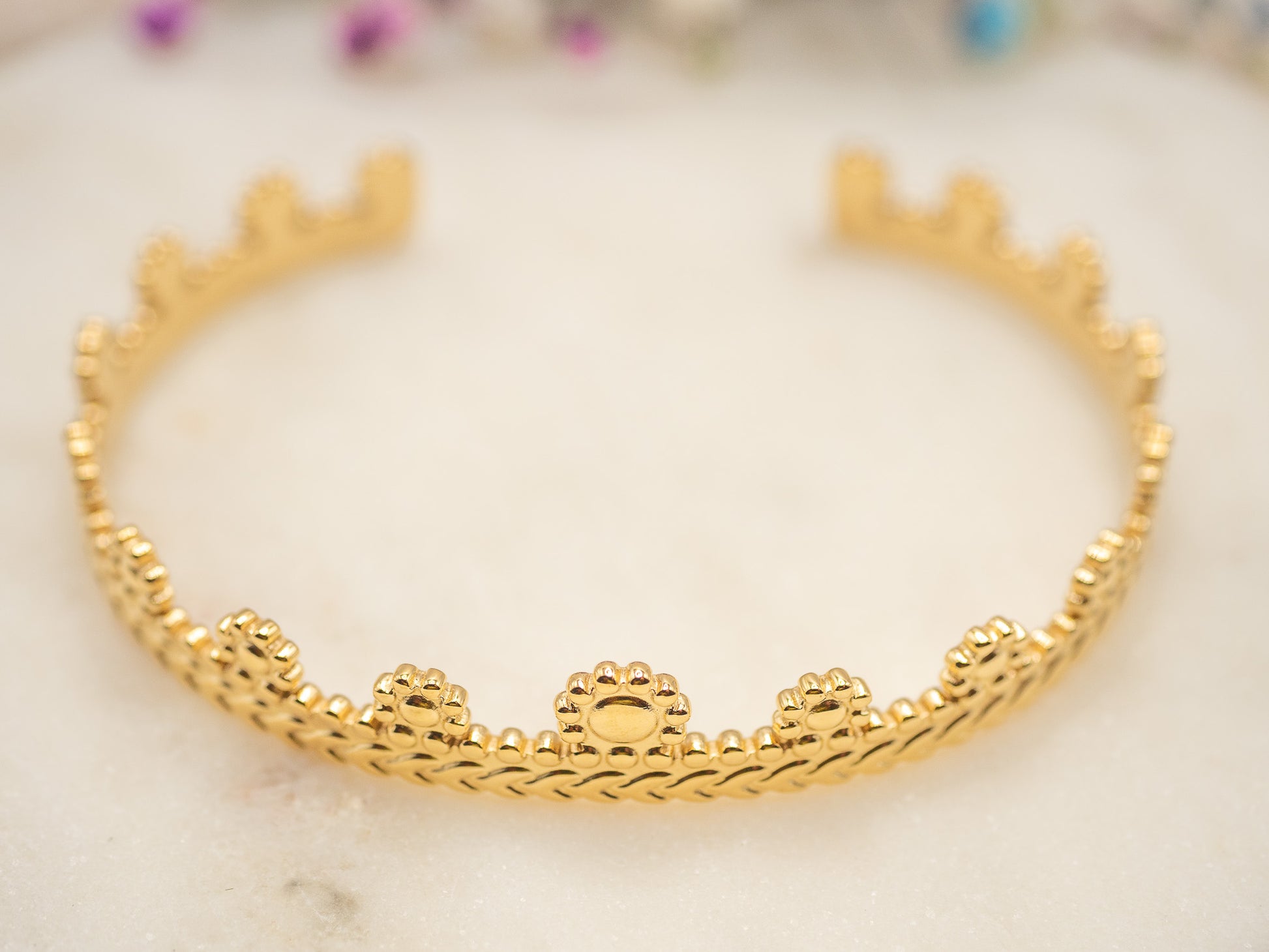 Inspiré d’une couronne ancienne retrouvée dans un conte de fées hivernal, Crownleaf Bangle est un jonc ouvert finement travaillé qui évoque la royauté discrète. Sa structure en plaqué or 18 carats est ornée d’un délicat motif de feuilles tressées et de mini perles qui forment des arcs réguliers, rappelant les créneaux d’un diadème ou les feuillages givrés des jardins anglais. Léger et facile à porter, il se glisse au poignet pour une touche élégante, raffinée et subtilement féérique.