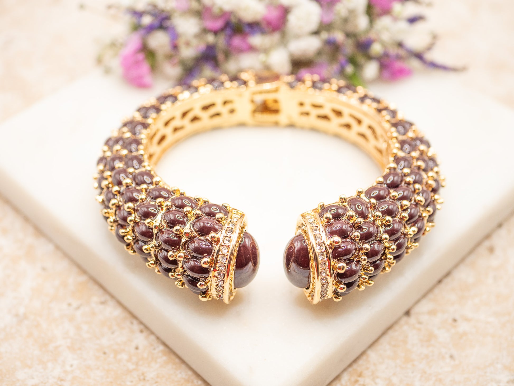 Covent est un bracelet massif en plaqué or 18 carats, entièrement recouverte de cabochons bombés en grenat, finement sertis et soulignés par une double ligne de zircons clairs qui rehaussent l’ensemble comme une broderie de lumière. Son volume généreux, ses détails ciselés, et son poids visuel imposant en font une pièce d’exception, conçue pour celles qui n’ont jamais peur d’en faire trop — et qui le font parfaitement bien.