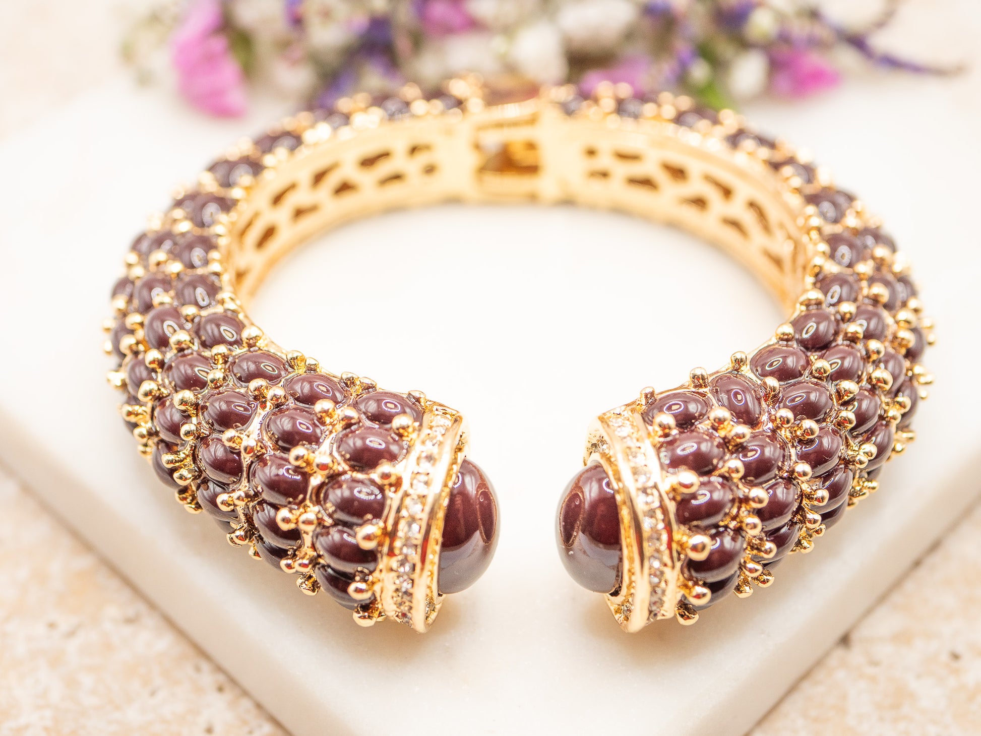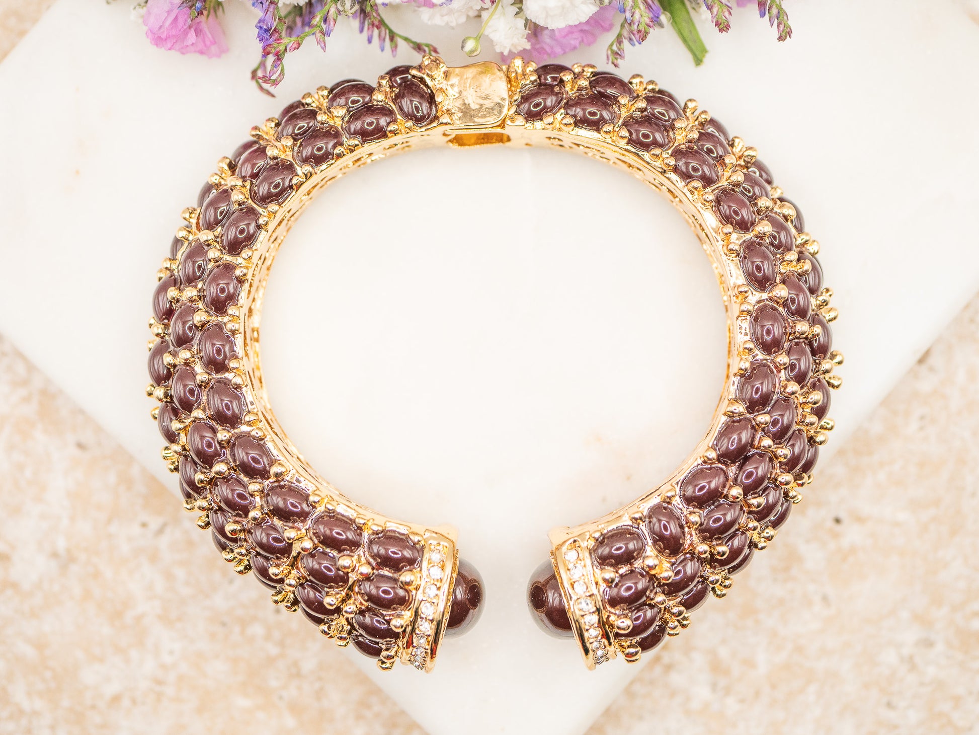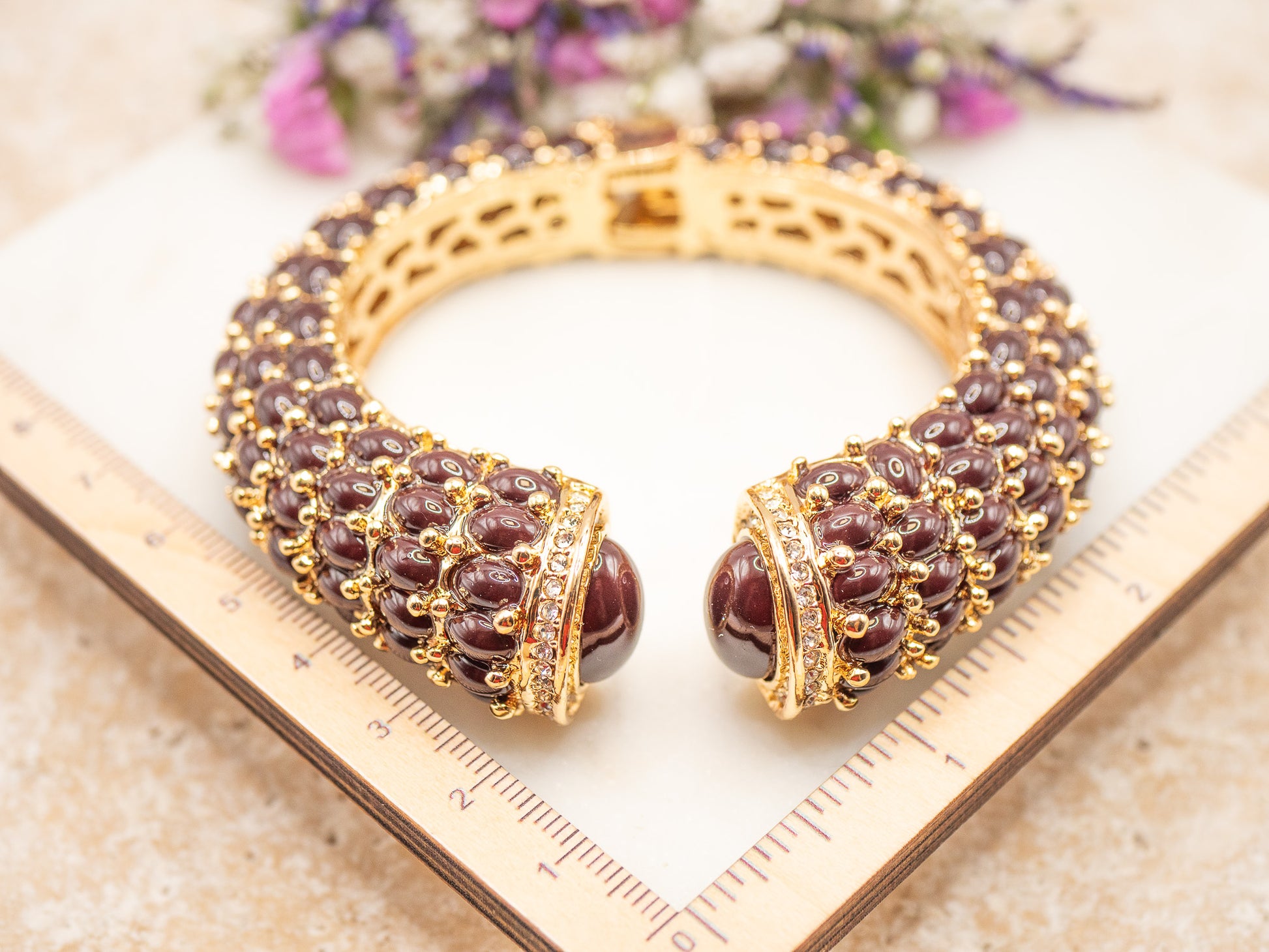 Le bracelet mesure environ 4,5 cm de largeur au point le plus épais. Les cabochons ovales en résine grenat mesurent chacun environ 7 mm de long sur 5 mm de large, montés en rangées régulières sur toute la surface extérieure. Le diamètre intérieur est d’environ 6 cm, avec un fermoir rigide à charnière qui assure une tenue parfaite autour du poignet.