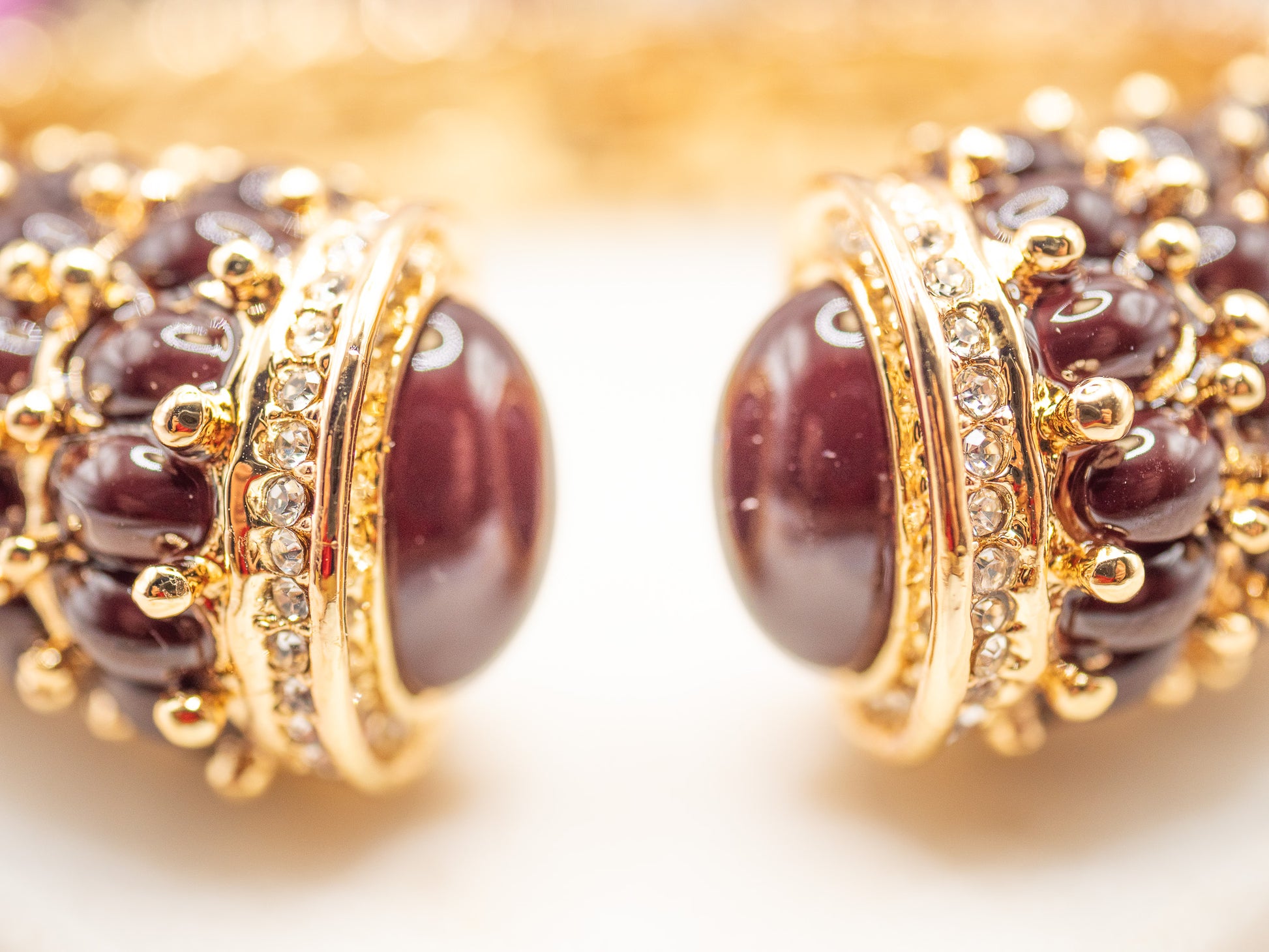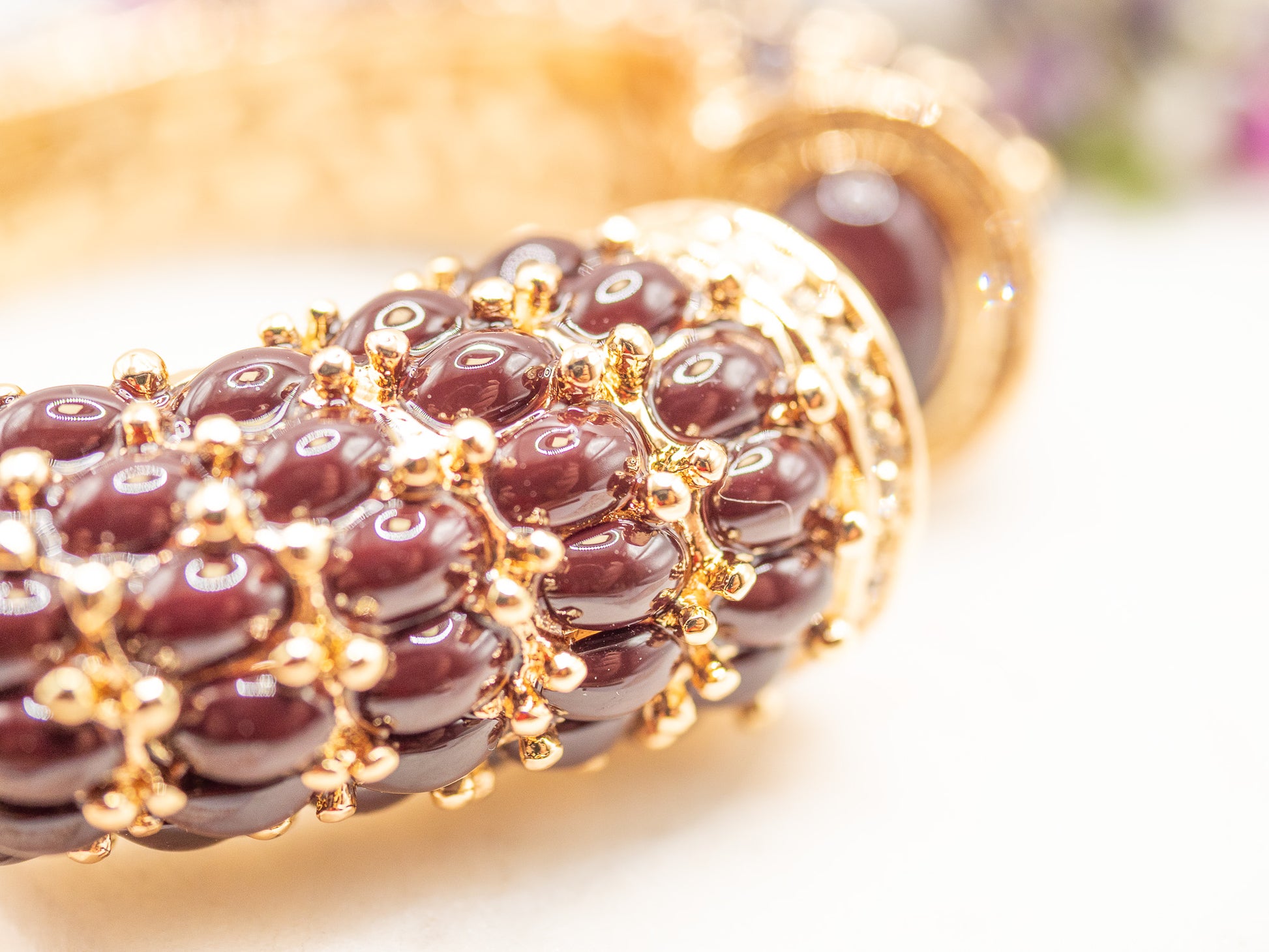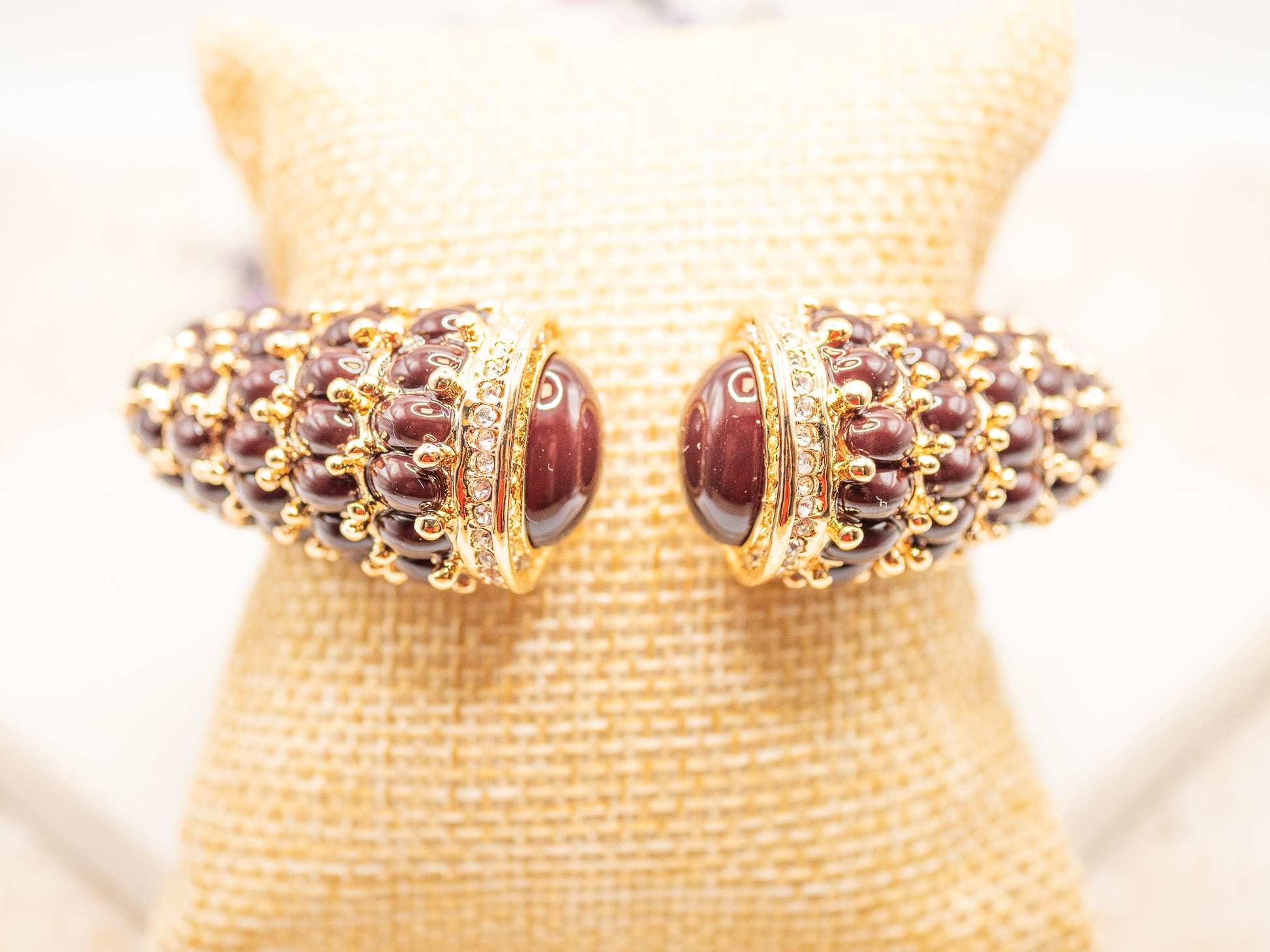 Le bracelet mesure environ 4,5 cm de largeur au point le plus épais. Les cabochons ovales en résine grenat mesurent chacun environ 7 mm de long sur 5 mm de large, montés en rangées régulières sur toute la surface extérieure. Le diamètre intérieur est d’environ 6 cm, avec un fermoir rigide à charnière qui assure une tenue parfaite autour du poignet.
