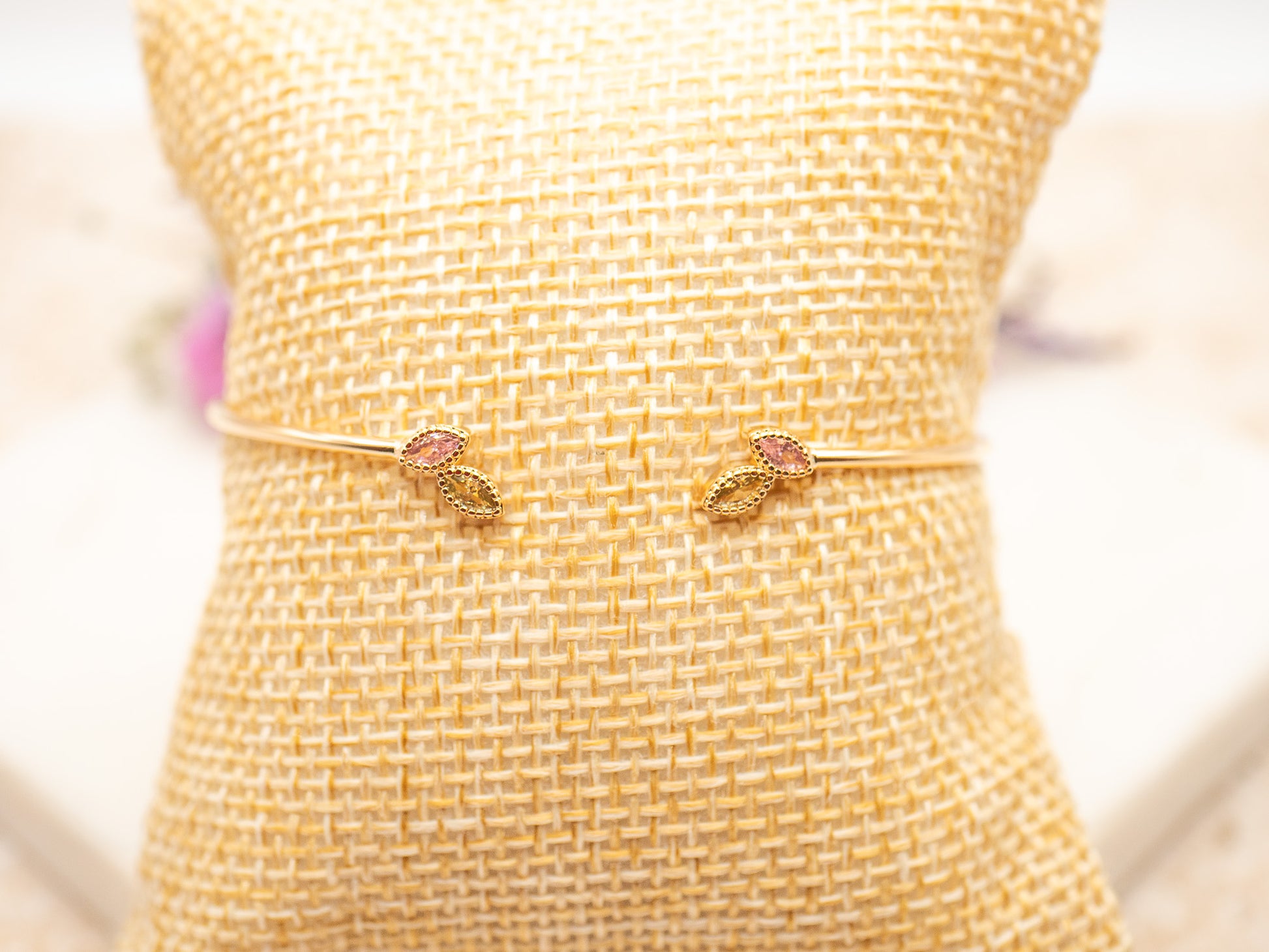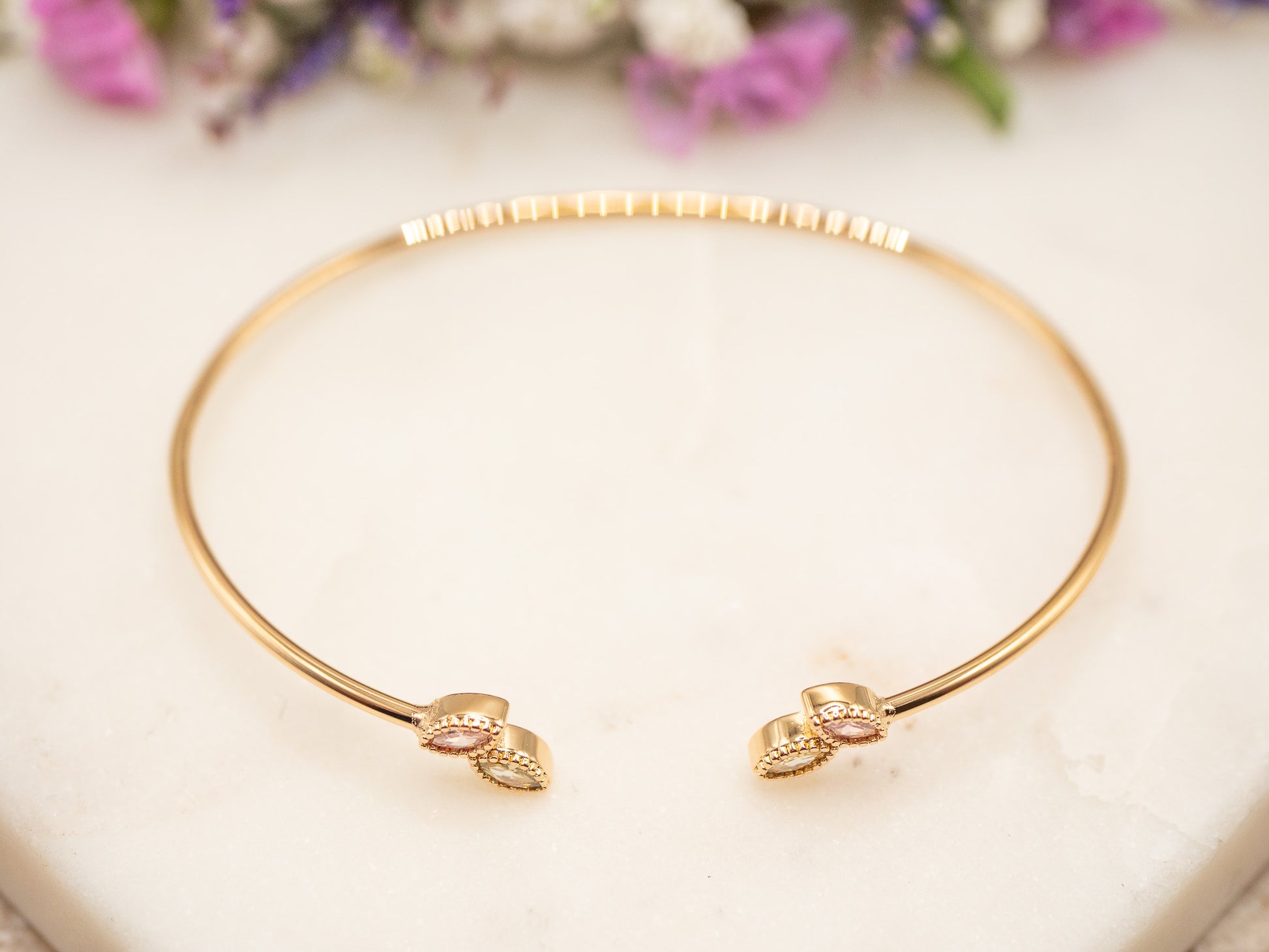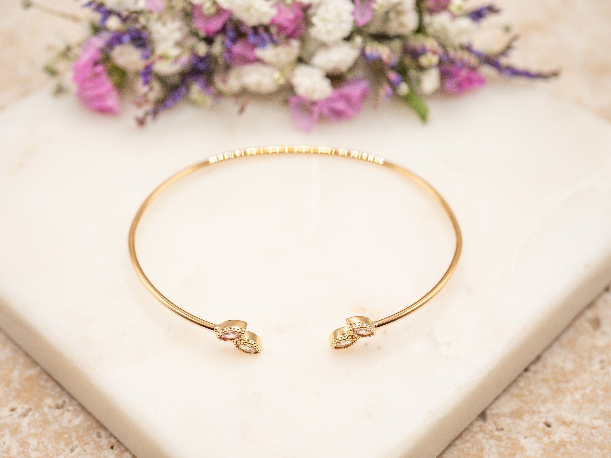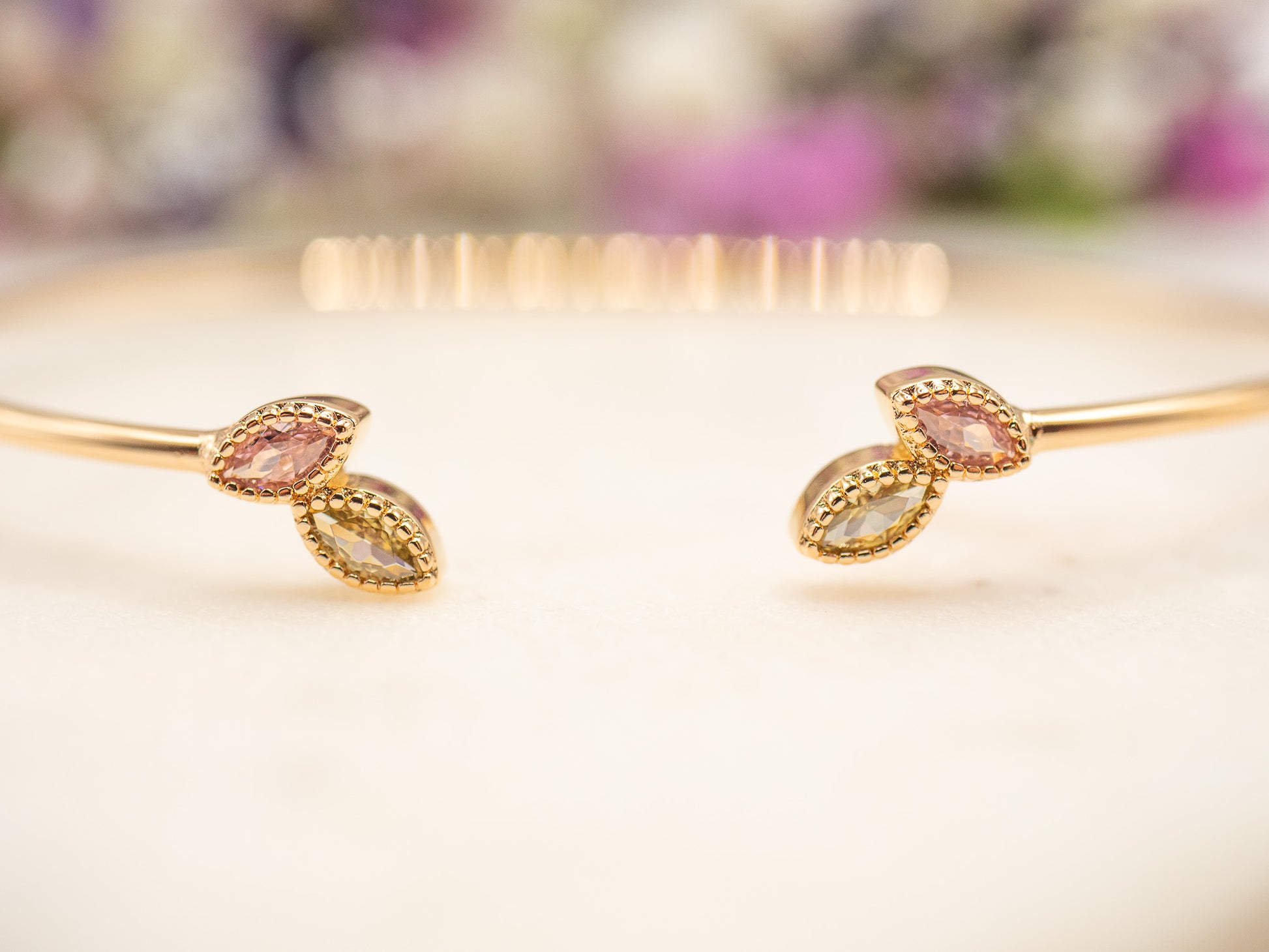 Maida, c’est le bracelet des femmes qui maîtrisent l’art de la nuance. Un jonc fin en plaqué or 18 carats, dont la structure ouverte vient se refermer délicatement sur deux cristaux taille marquise à la féminité subtile. L’un affiche un rose poudré doux, l’autre un champagne translucide, toutes deux finement facettées et bordées d’un serti perlé doré qui capte la lumière au moindre mouvement.