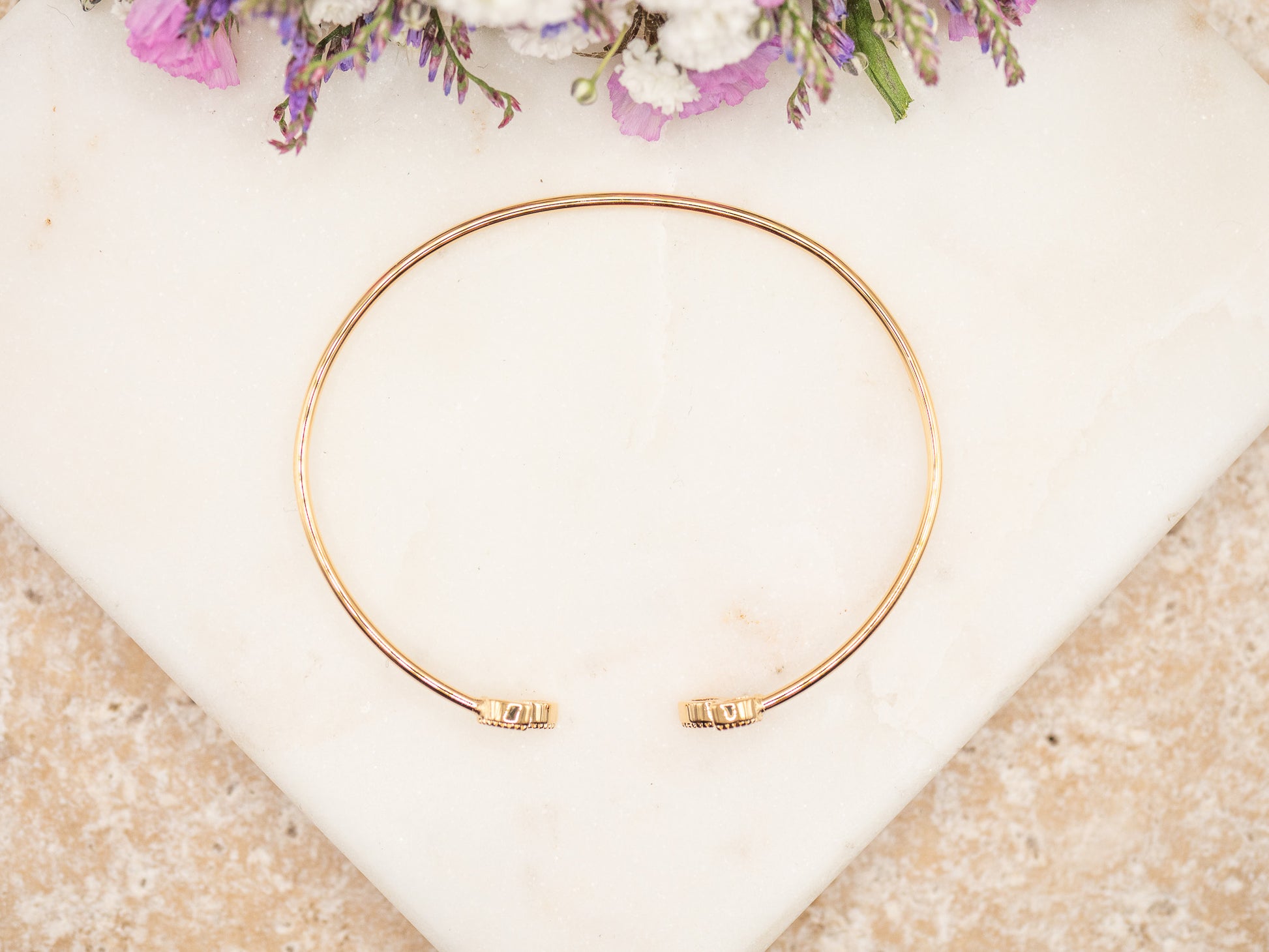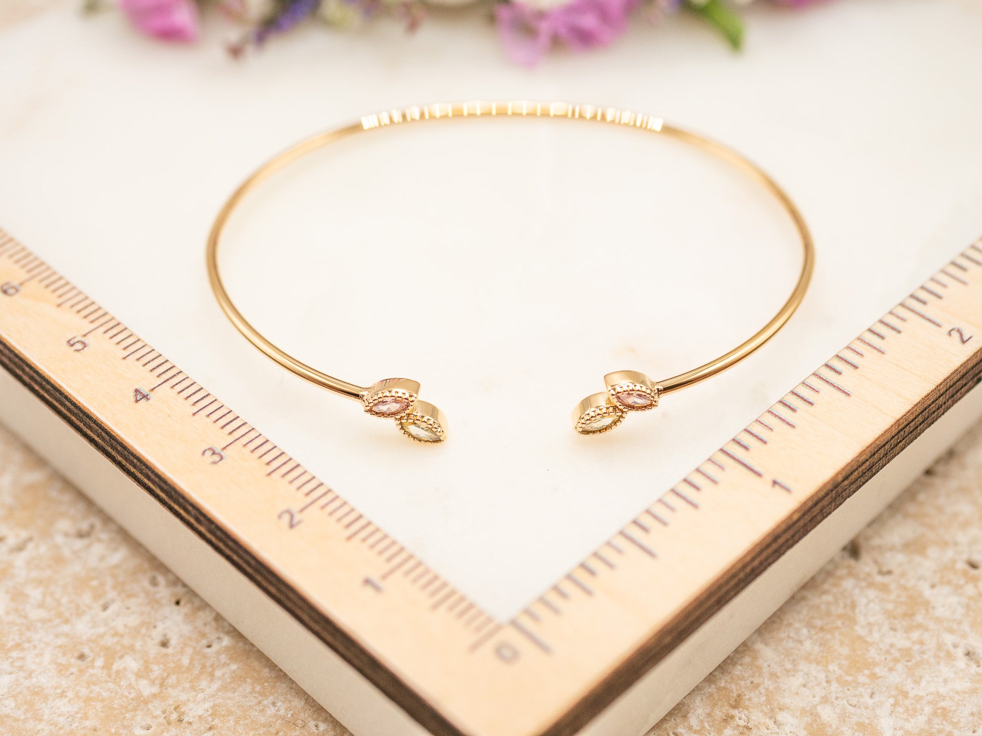 Chaque pierre mesure environ 6 mm de long sur 3 mm de large, et repose sur un embout légèrement bombé, formant une double ponctuation élégante au poignet. L’ensemble du bracelet mesure environ 6 cm de diamètre intérieur, avec une légère souplesse à l’ouverture pour s’ajuster facilement.