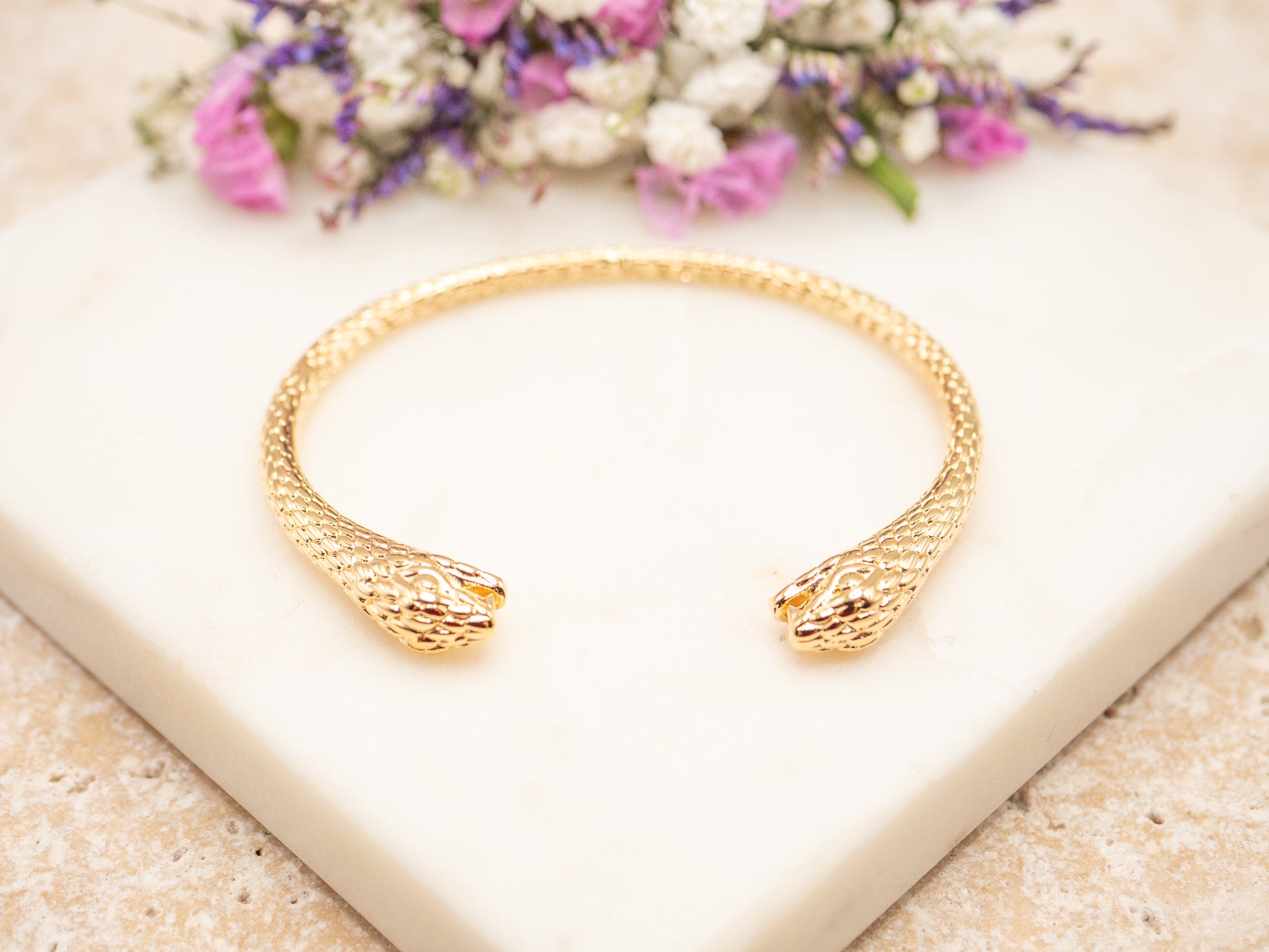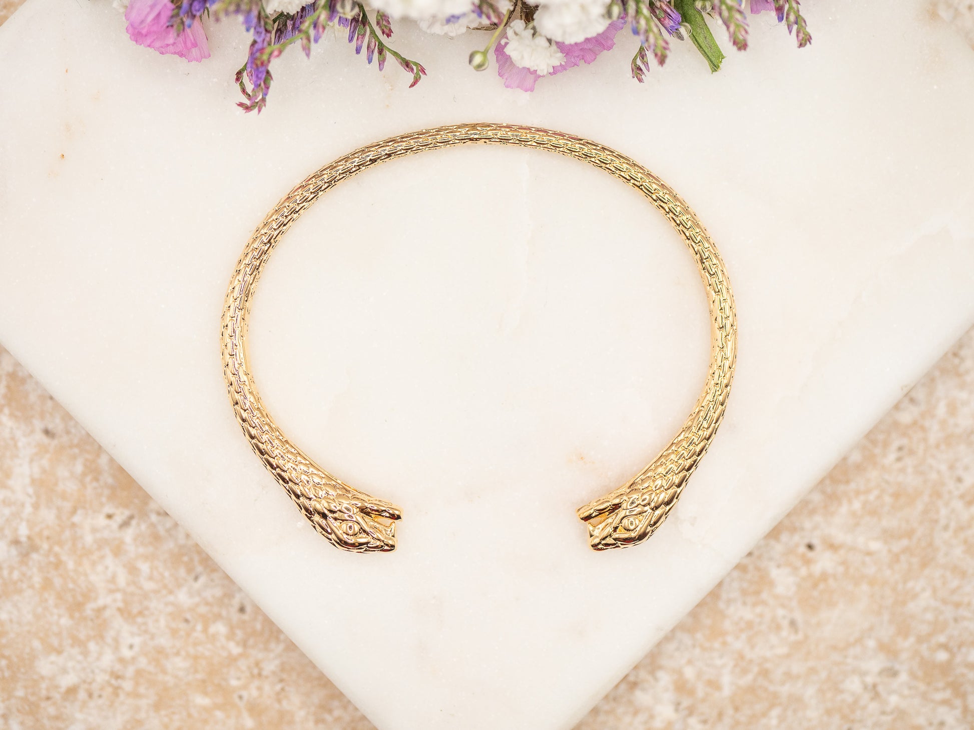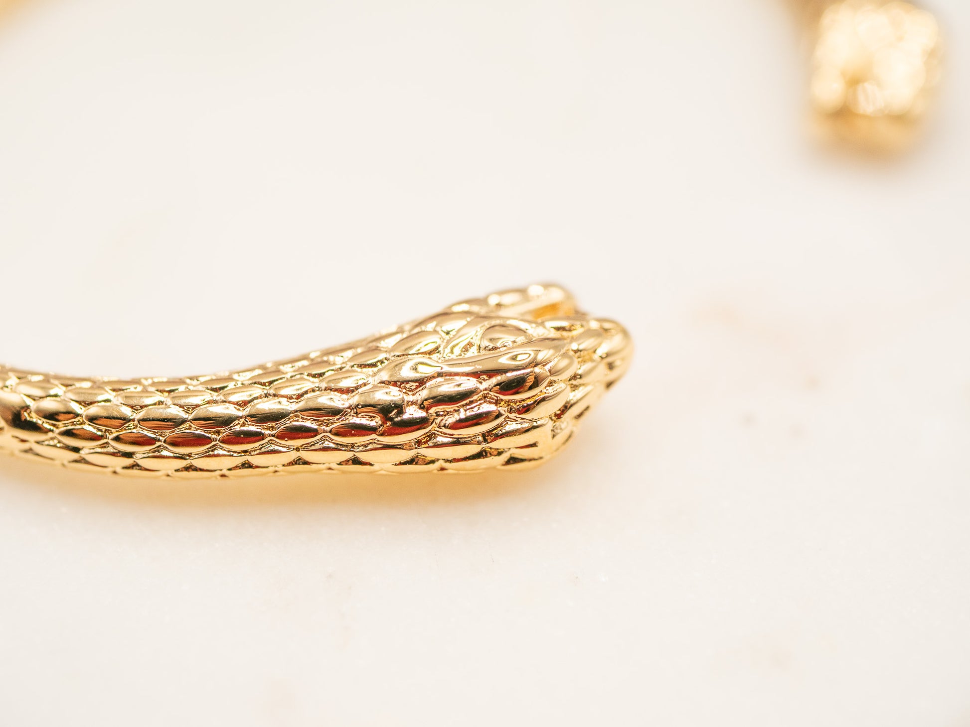 Whitechapel, c’est le bracelet des femmes indomptables. Un jonc rigide en plaqué or 18 carats, sculpté dans un motif d’écailles fines qui épouse le poignet avec intensité. À chaque extrémité, deux têtes de serpent finement gravées se font face, dans un face-à-face symbolique et presque hypnotique. Le détail est saisissant : regard perçant, crocs stylisés, relief parfaitement ciselé. Le tout donne à ce bijou une puissance visuelle rare.