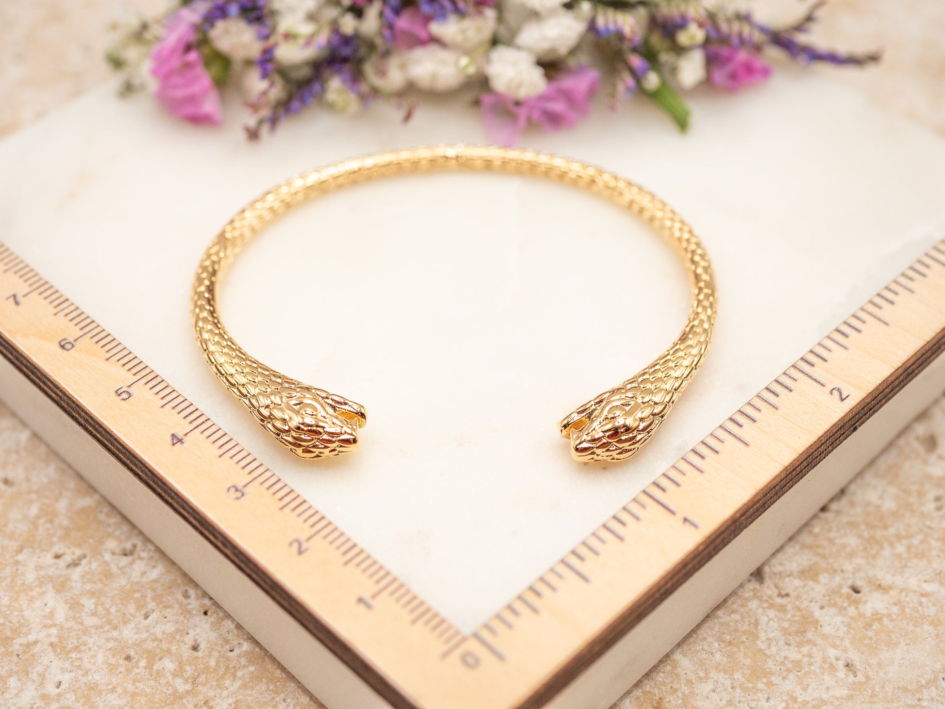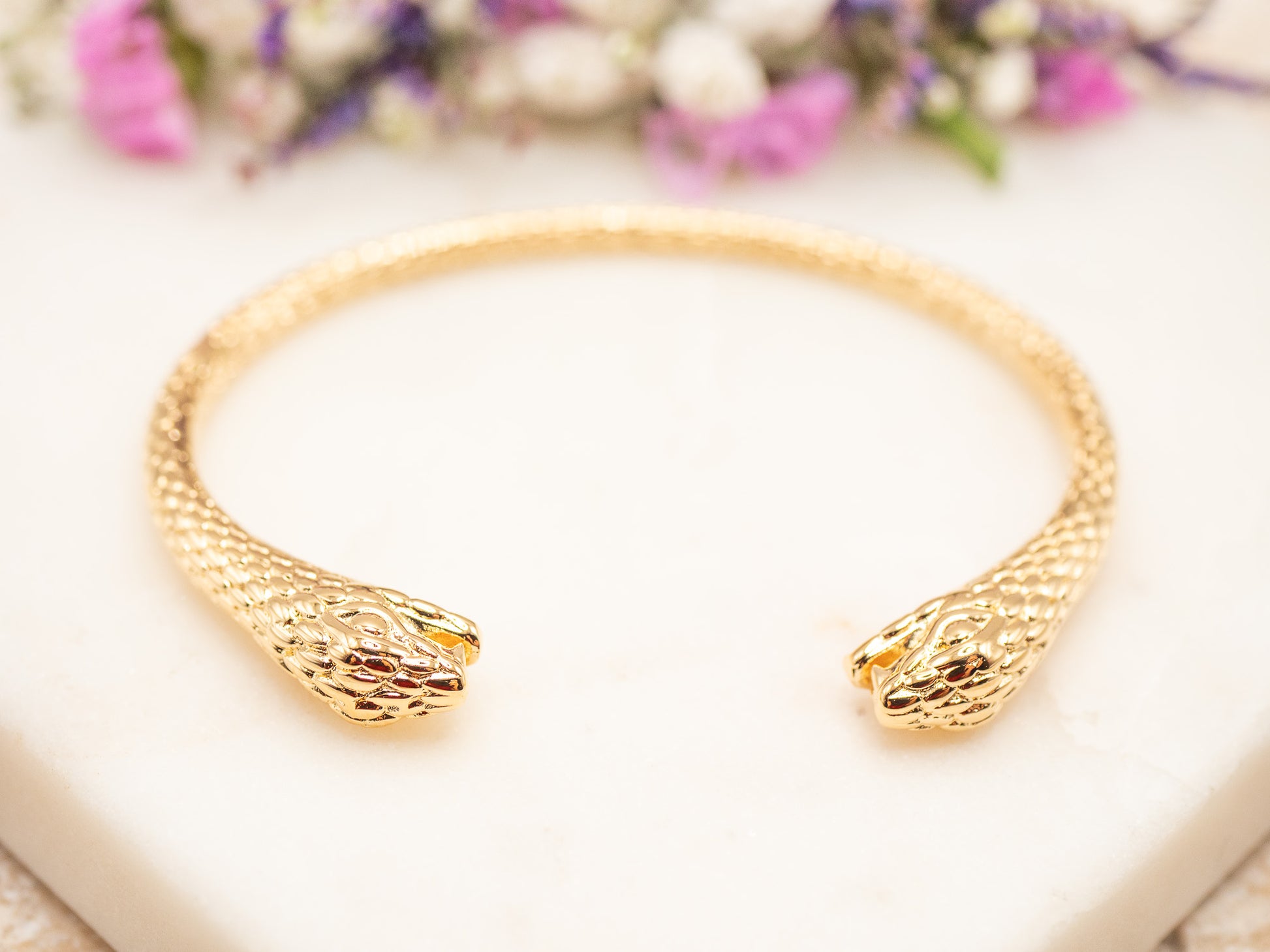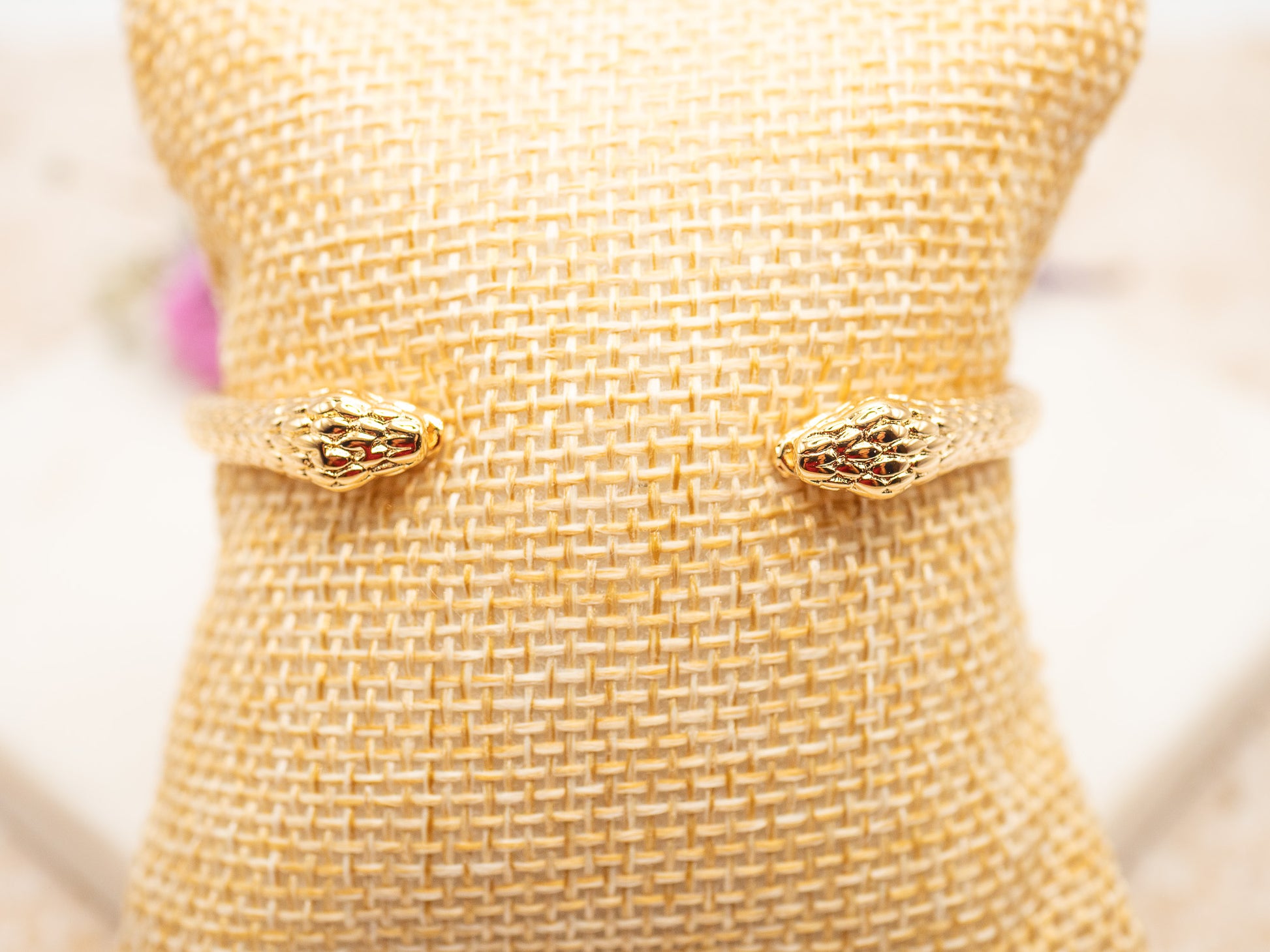 Whitechapel, c’est le bracelet des femmes indomptables. Un jonc rigide en plaqué or 18 carats, sculpté dans un motif d’écailles fines qui épouse le poignet avec intensité. À chaque extrémité, deux têtes de serpent finement gravées se font face, dans un face-à-face symbolique et presque hypnotique. Le détail est saisissant : regard perçant, crocs stylisés, relief parfaitement ciselé. Le tout donne à ce bijou une puissance visuelle rare.