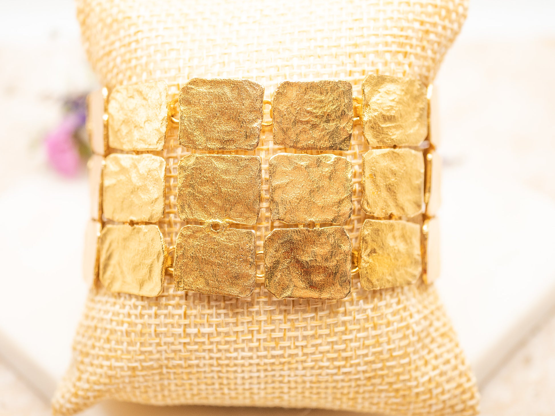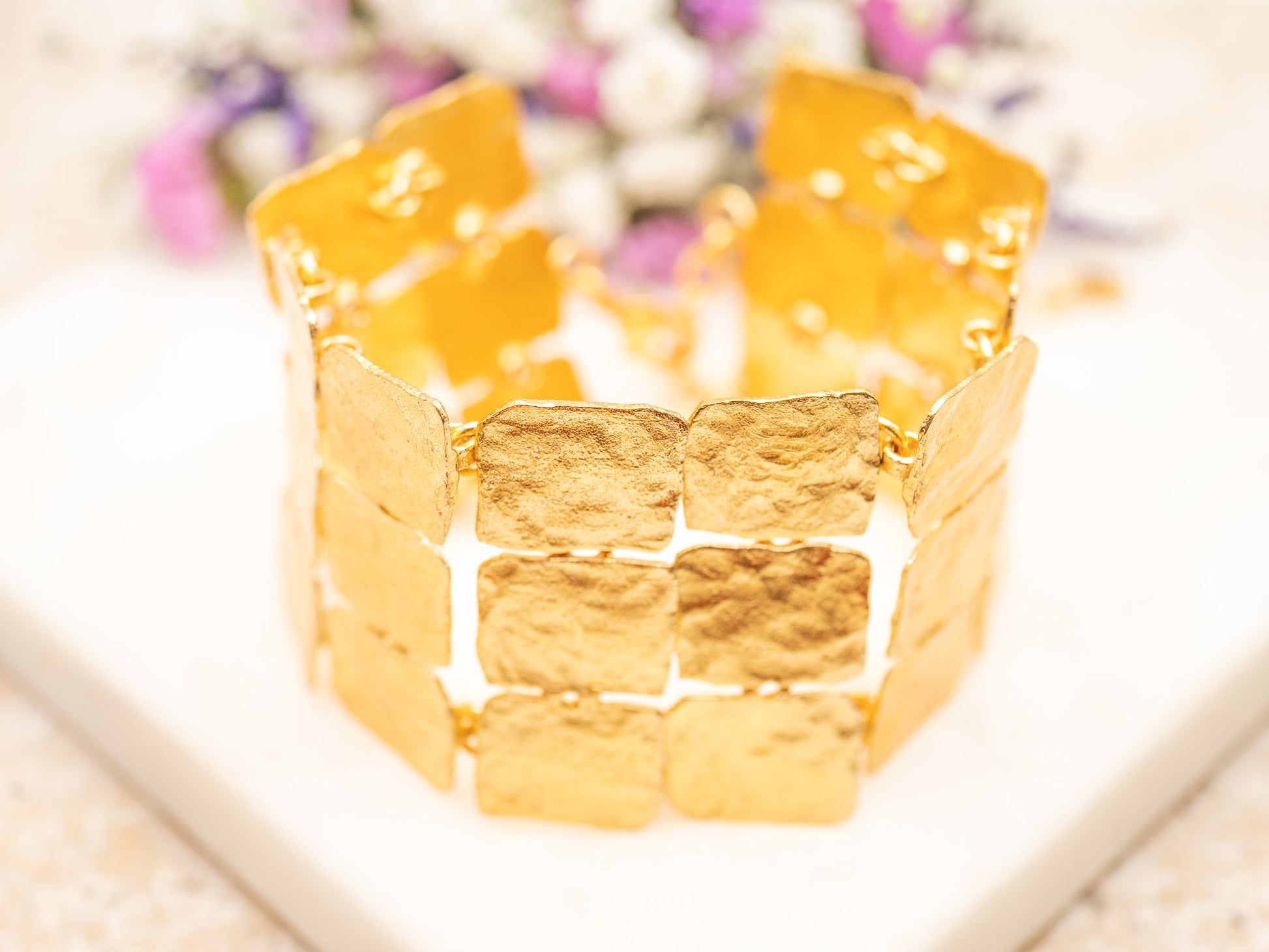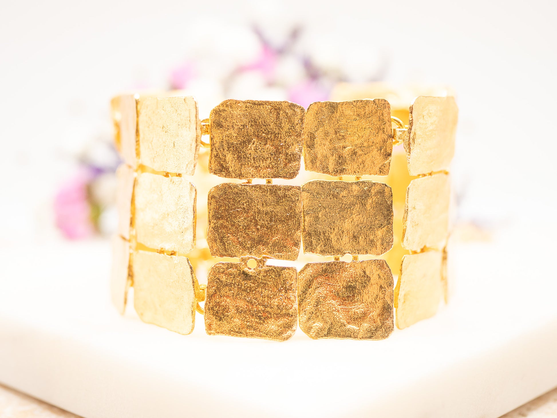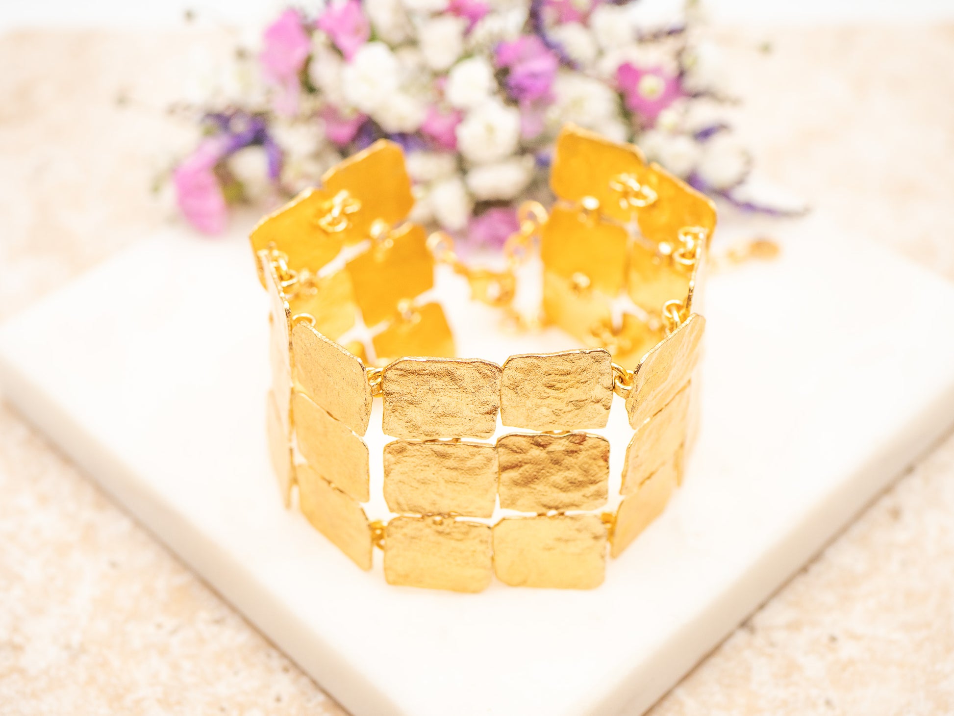 Dalston, c’est la manchette brute et solaire, celle qui capture l’énergie d’un East London en pleine effervescence créative. Composée de plaques martelées en plaqué or 18 carats, elle joue sur les contrastes de texture et de lumière avec un naturel audacieux.