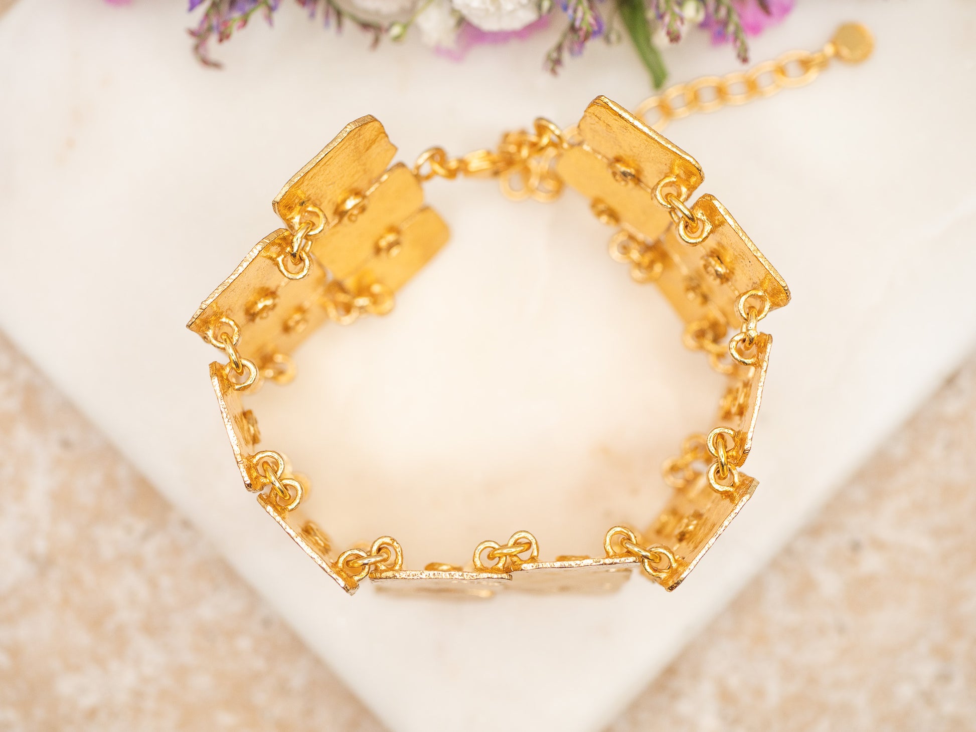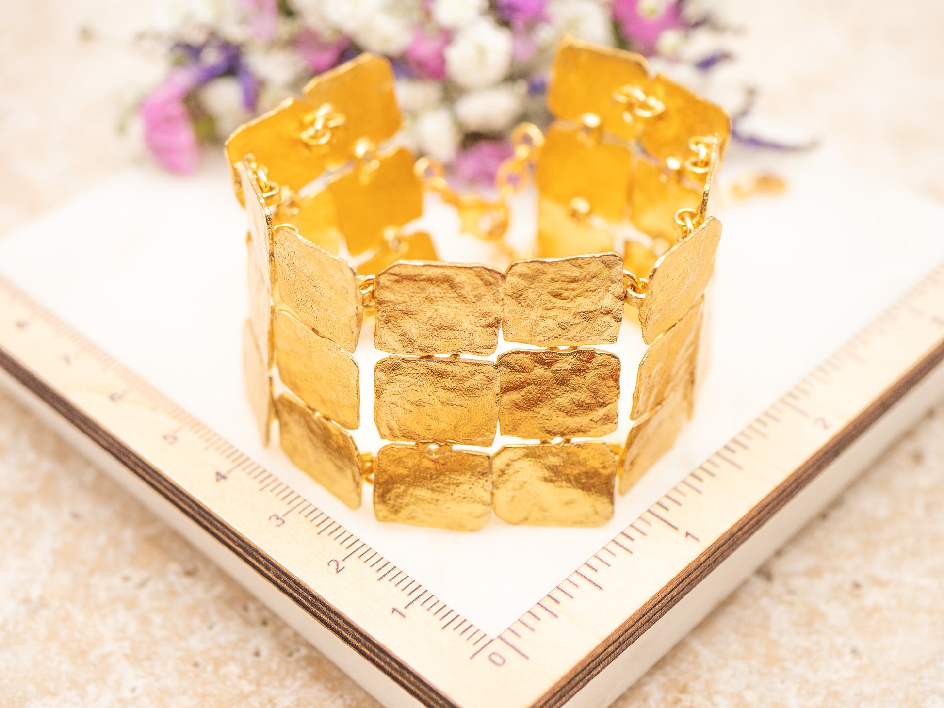 Chaque maillon mesure environ 2,2 cm de haut pour 1,8 cm de large, formant une structure souple mais imposante de près de 5,5 cm de hauteur totale au poignet. Le tout est relié par de fines attaches dorées, qui laissent deviner la peau et allègent visuellement l’ensemble.