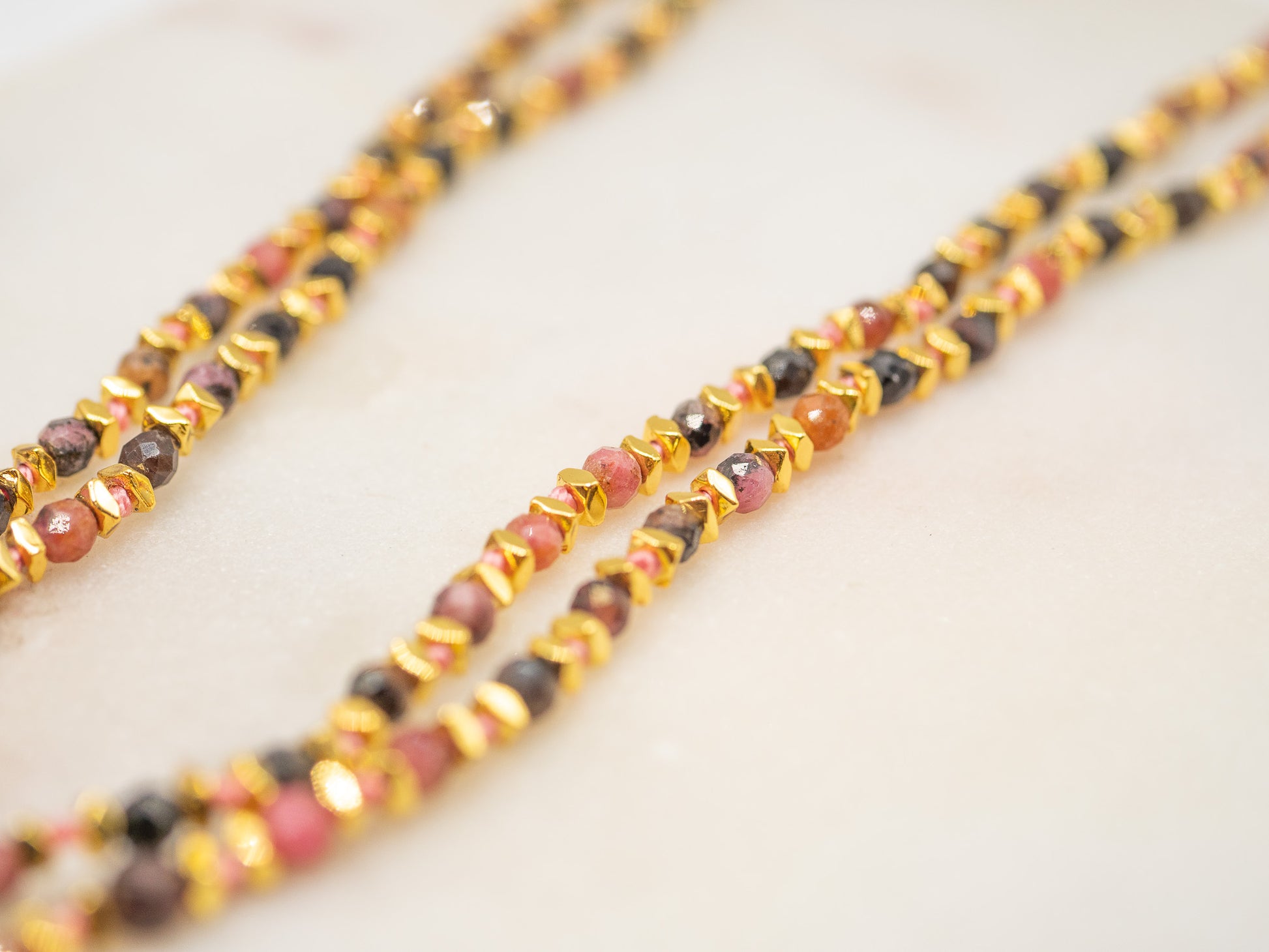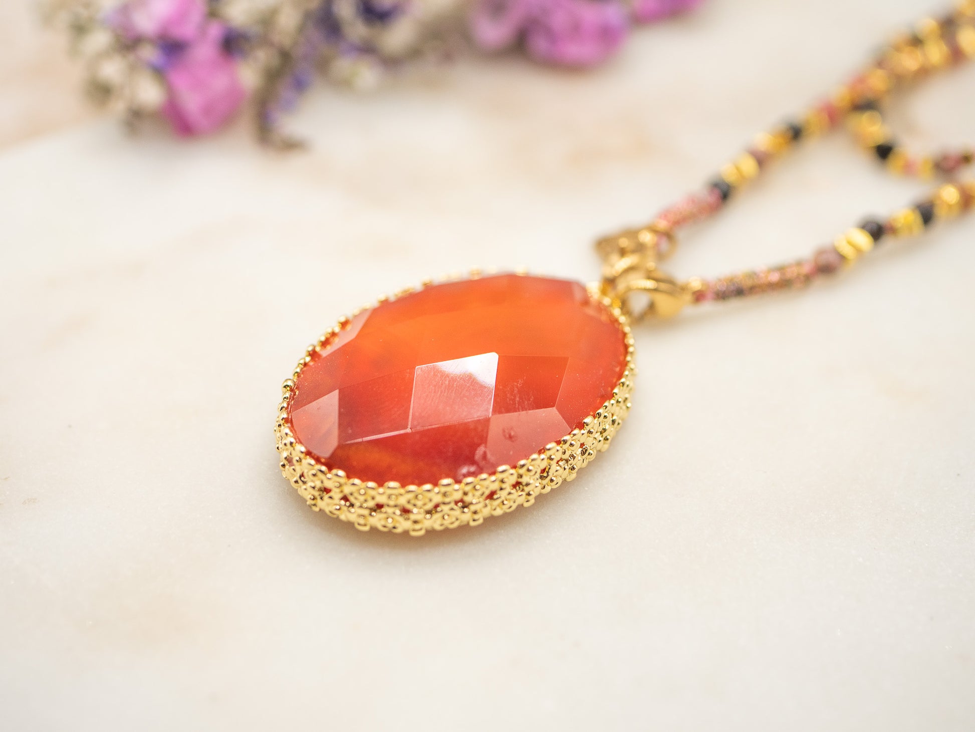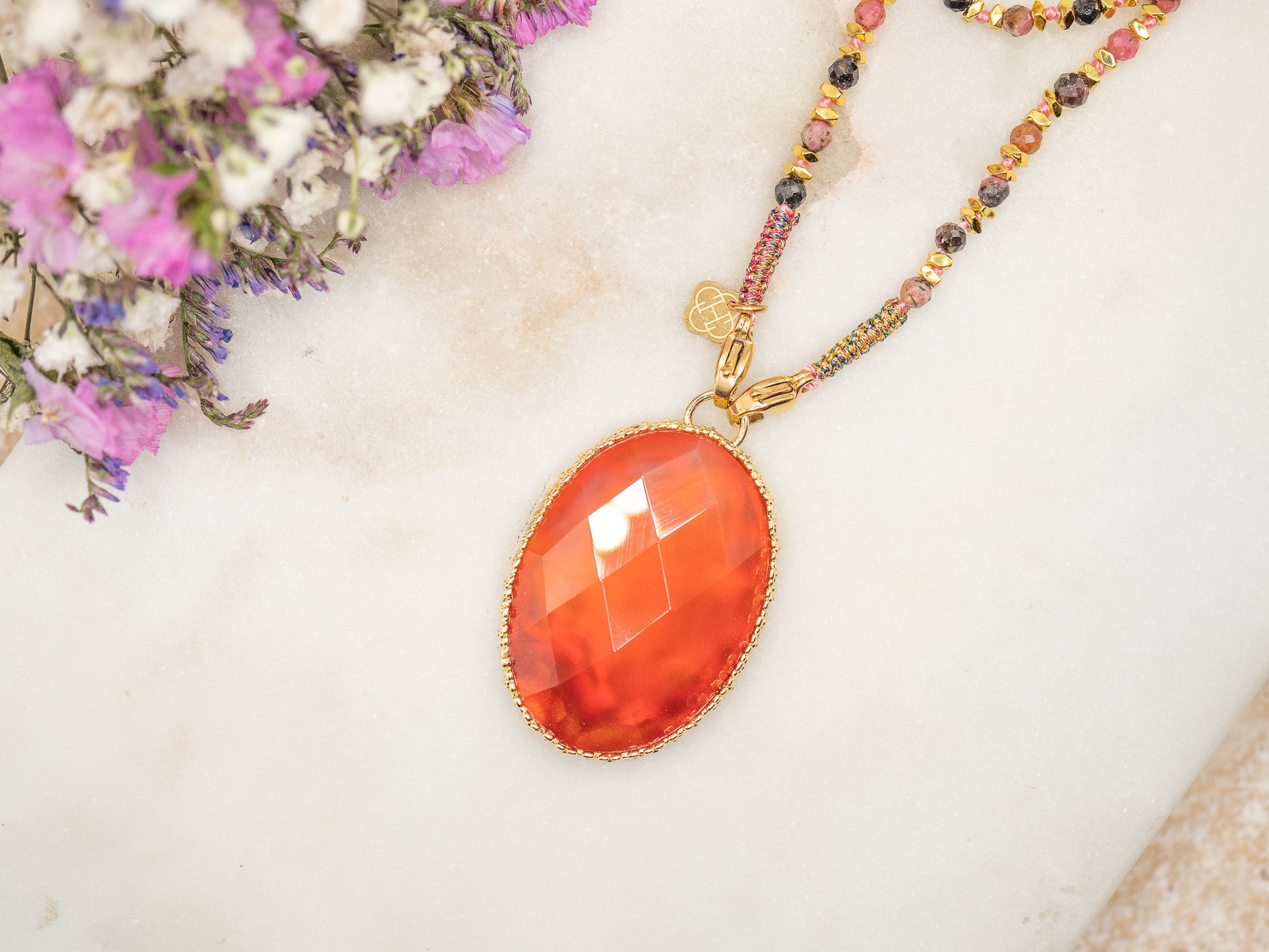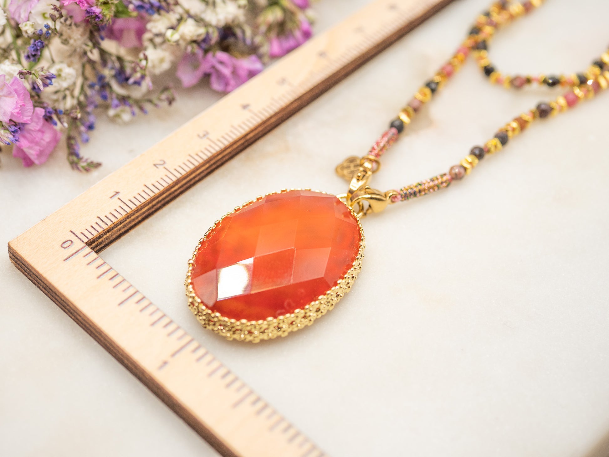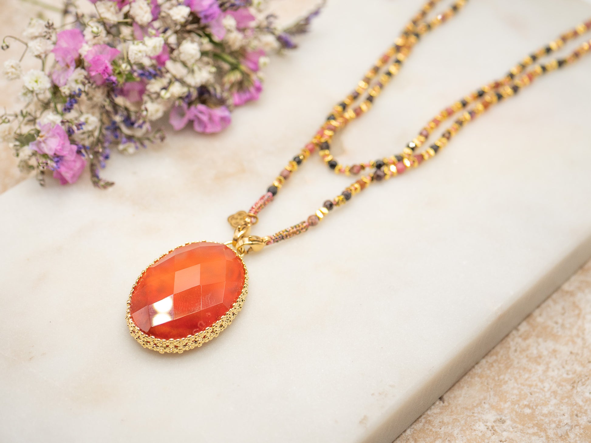 Affirmez votre style avec Ealing, un collier audacieux et élégant dont le pendentif en cornaline facettée (4,5 x 3,2 cm) capte chaque rayon de lumière. Sa couleur chaude, entre orange et rouge intense, évoque l’énergie et la vitalité. La pierre est sublimée par un serti texturé en acier inoxydable doré, et suspendue à un collier de perles semi-précieuses facettées (3-4 mm).